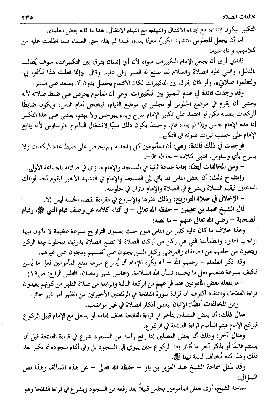 وقد ذكر العلماء -رحمهم الله- أنه يكُره للإمام أن يُسرع سرعة تمنع المأمومين فعل ما يُسن فكيف بسرعة لقنعهم فعل ما يجب، نسأل الله السلامة. (مجالس شهر رمضان، المجلس الرابع: ص 19).