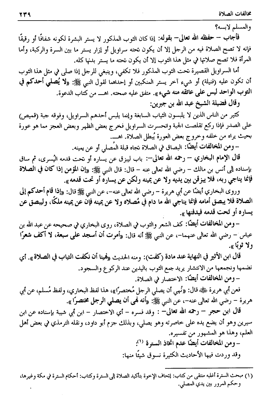 - ومن المخالفات أيضًا: كف الشعر والثوب في الصلاة، روى البخاري في صحيحه عن عبد الله بن عباس -رضي الله تعالى عنهما-، عن النبي -صَلَّى اللَّهُ عَلَيْهِ وَسَلَّمَ- قال: "أمرت أن أسجد على سبعة، لا أكف شعرًا ولا ثوبًا".