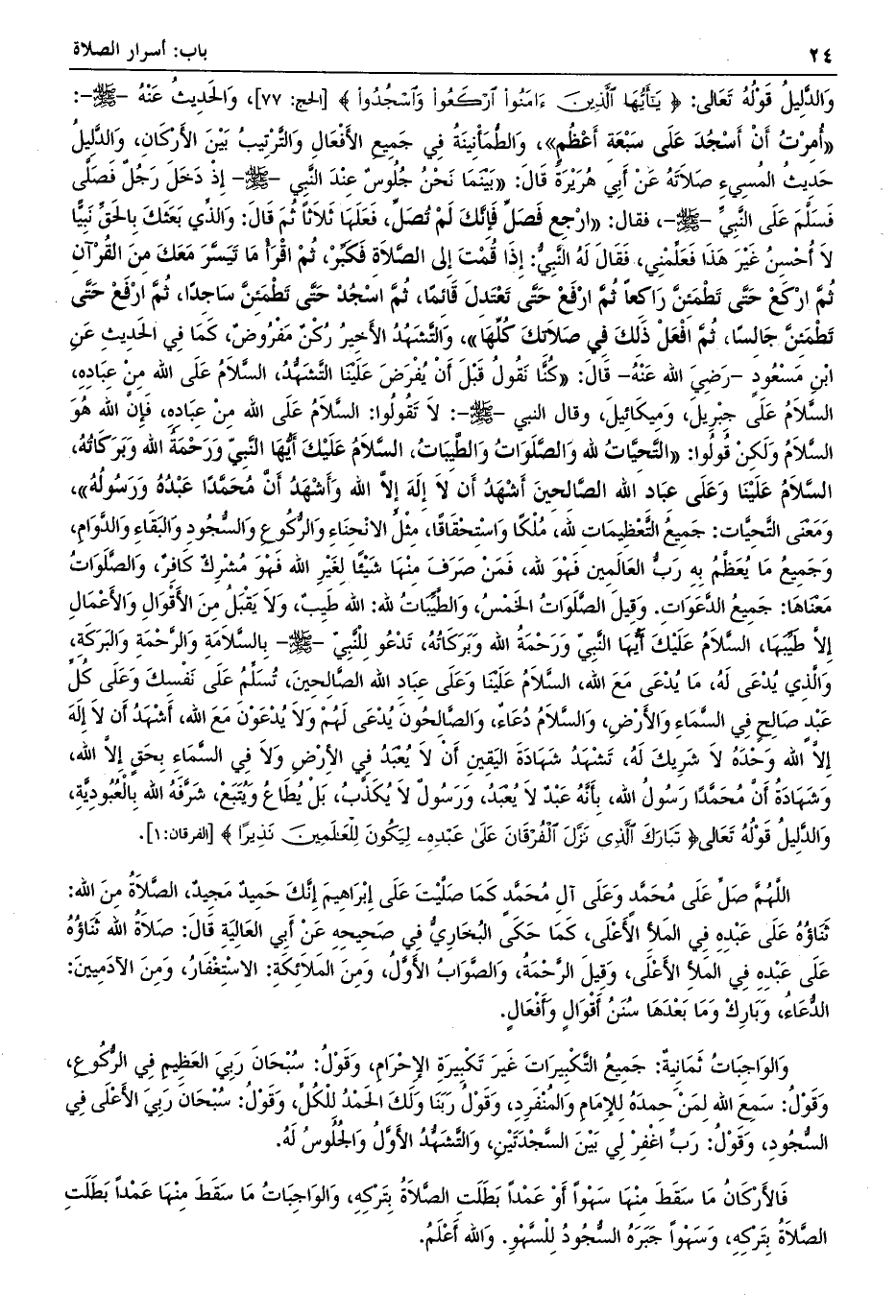والدليل قوله تعالى: {يَا أَيُّهَا الَّذِينَ آمَنُوا ارْكَعُوا وَاسْجُدُوا} [الحج: 77]، والحديث عنه -صَلَّى اللَّهُ عَلَيْهِ وَسَلَّمَ-: "أُمِرْتُ أن أسجد على سبعة أعظم"، والطمأنينة في جميع الأفعال، والترتيب بين الأركان. والدليل حديث المسيء صلاته عن أبي هريرة قال: "بينما نحن جلوس عند النبي صَلَّى اللَّهُ عَلَيْهِ وَسَلَّمَ إذ دخل رجل فصلى [فقام] فسلم على النبي -صَلَّى اللَّهُ عَلَيْهِ وَسَلَّمَ- قال: ارجع فصل فإنك لم تصل، فعلها ثلاثًا، ثم قال: والذي بعثك بالحق نبيًا لا أحسن غير هذا فعلمني، فقال له النبي صَلَّى اللَّهُ عَلَيْهِ وَسَلَّمَ: إذا قمت إلى الصلاة فكبِّرْ، ثم اقرأ ما تيسر معك من القرآن، ثم اركع حتى تطمئن راكعًا، ثم ارفع حتى تعتدل قائمًا، ثم اسجد حتى تطمئن ساجدًا، ثم ارفع حتى تطمئن جالسًا، ثم افعل ذلك في صلاتك كلها"، والتشهد الأخير ركن مفروض، كما في الحديث عن ابن مسعود -رضي الله عنه- قال: "كنا نقول قبل أن يفرض علينا التشهد: السلام على الله من عباده، السلام على جبريل وميكائيل" وقال النبي -صَلَّى اللَّهُ عَلَيْهِ وَسَلَّمَ-: "لا تقولوا: السلام على الله عن عباده، فإن الله هو السلام ولكن قولوا: التحيات لله والصلوات والطيبات، السلام عليك أيها النبي ورحمة الله وبركاته، السلام علينا وعلى عباد الله الصالحين، أشهد أن لا إله إلا الله وأشهد أن محمدًا عبده ورسوله".