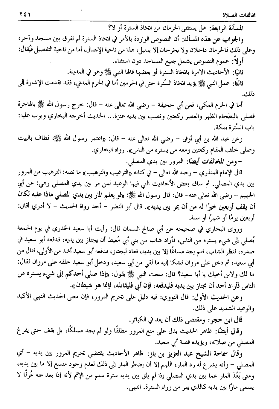وقال سماحة الشيخ عبد العزيز بن باز: ظاهر الأحاديث يقتضي تحريم المرور بين يديه -أي المصلي- وأنه يشرع له رد المار، اللهم إلا أن يضطر المار إلى ذلك لعدم وجود متسع إلا ما بين يديه، ومتى بَعُدَ المار عما بين يدي المصلي إذا لم يلق بين يديه سترة سلم من الإثم لأنه إذا بعد عنه عُرفًا لا يسمى مارًا بين يديه كالذي يمر من وراء السترة. انتهى.