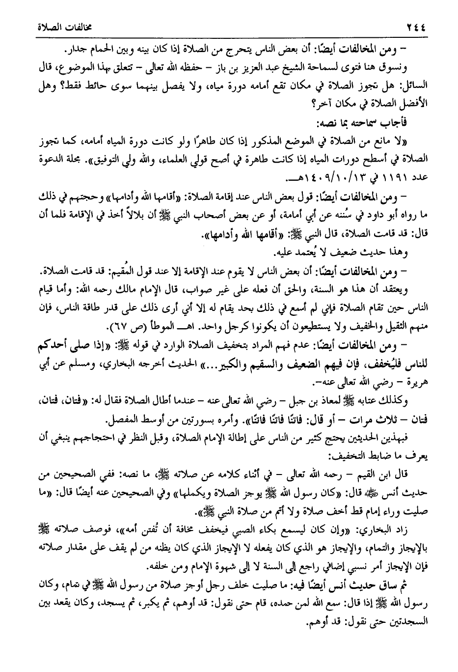 - ومن المخالفات أيضًا: عدم فهم المراد بتخفيف الصلاة الوارد في قوله -صَلَّى اللَّهُ عَلَيْهِ وَسَلَّمَ-: "إذا صلى أحدكم للناس فليُخفف، فإن فيهم الضعيف والسقيم والكبير ... " الحديث أخرجه البخاري، ومسلم عن أبي هريرة -رضي الله تعالى عنه-.