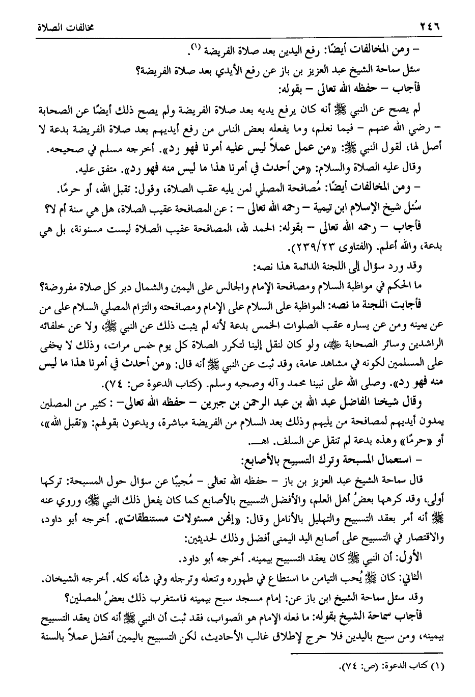 فأجابت اللجنة ما نصه: المواظبة على السلام على الإمام ومصافحته والتزام المصلي السلام على من عن يمينه ومن عن يساره عقب الصلوات الخمس بدعة لأنه لم يثبت ذلك عن النبي -صَلَّى اللَّهُ عَلَيْهِ وَسَلَّمَ-، ولا عن خلفائه الراشدين وسائر الصحابة -رضي الله عنهم -، ولو كان لنقل إلينا لتكرر الصلاة كل يوم خمس مرات، وذلك لا يخفى على المسلمين لكونه في مشاهد عامة، وقد ثبت عن النبي -صَلَّى اللَّهُ عَلَيْهِ وَسَلَّمَ- أنه قال: "من أحدث في أمرنا هذا ما ليس منه فهو رد". وصلى الله على نبينا محمد وآله وصحبه وسلم. (كتاب الدعوة ص: 74).
