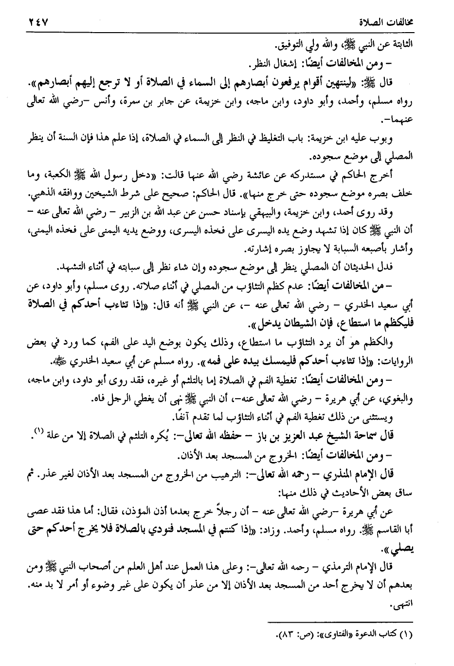 قال -صَلَّى اللَّهُ عَلَيْهِ وَسَلَّمَ-: "لينتهين أقوام يرفعون أبصارهم إلى السماء في الصلاة أو لا ترجع إليهم أبصارهم". رواه مسلم، وأحمد، وأبو داود، وابن ماجه، وابن خزيمة، عن جابر بن سمرة، وأنس -رضي الله تعالى عنهما-.