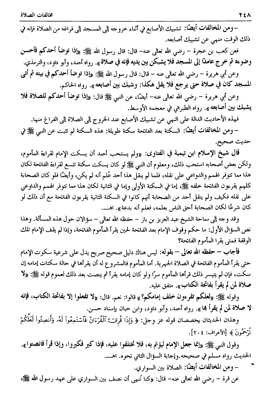 - ومن المخالفات أيضًا: السكتة بعد الفاتحة سكتة طويلة: هذه السكتة لم تثبت عن النبي -صَلَّى اللَّهُ عَلَيْهِ وَسَلَّمَ- في حديث صحيح.