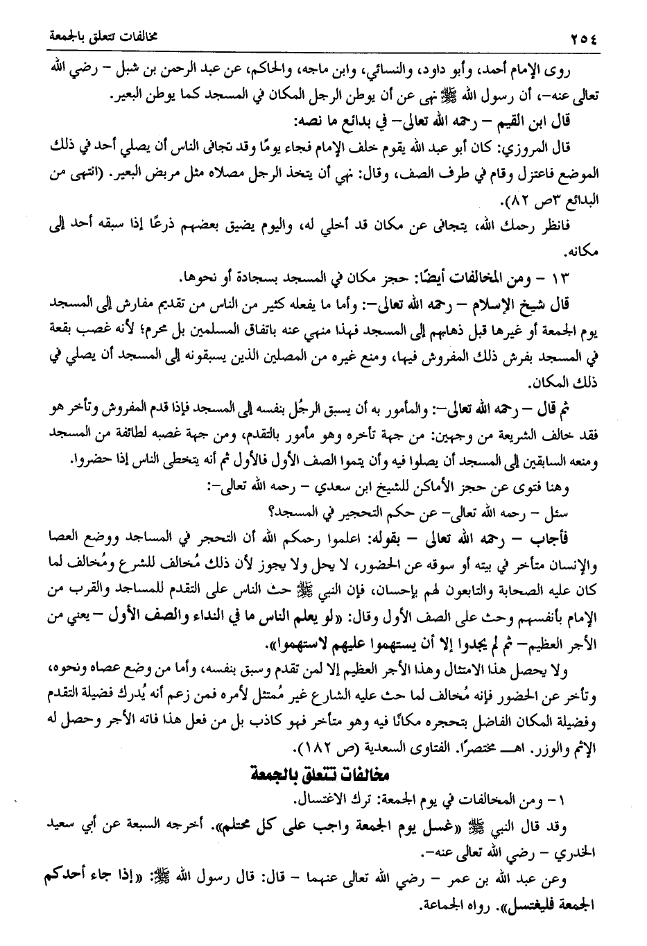 13 - ومن المخالفات أيضًا: حجز مكان في المسجد بسجادة أو نحوها.
