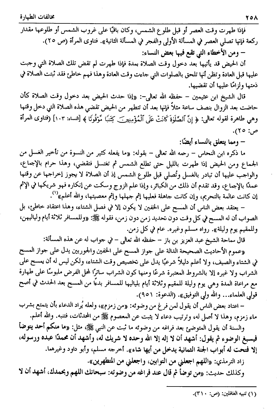 - يعتقد بعض الناس أن المسح على الخفين لا يكون إلا في فصل الشتاء، وهذا اعتقاد خاطئ، بل الصواب أن له المسح في كل وقت دون تحديد زمن دون زمن، فقوله -صَلَّى اللَّهُ عَلَيْهِ وَسَلَّمَ-: "وللمسافر ثلاثة أيام ولياليهن، وللمقيم يوم وليلة". رواه مسلم وغيره. عام في كل زمن.