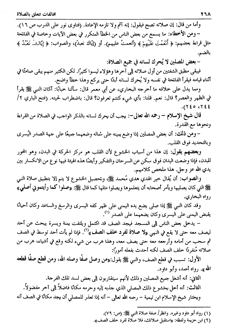 - يدخل بعض الناس إلى المسجد فيجد الصف قد اكتمل ويلتفت يمنة ويسرة يبحث عن أحد ليصف معه حتى لا يقع في النهي "لا صلاة لفرد خلف الصف" (¬2). فإذا لم يأت أحد توسط في الصف ثم سحب من أمامه وأرجعه معه حتى يصف معه، وهذا هرب من شيء لكنه وقع في أشياء، هرب من صلاته مُنفردًا خلف الصف لكنه أحدث بفعله أمورًا: