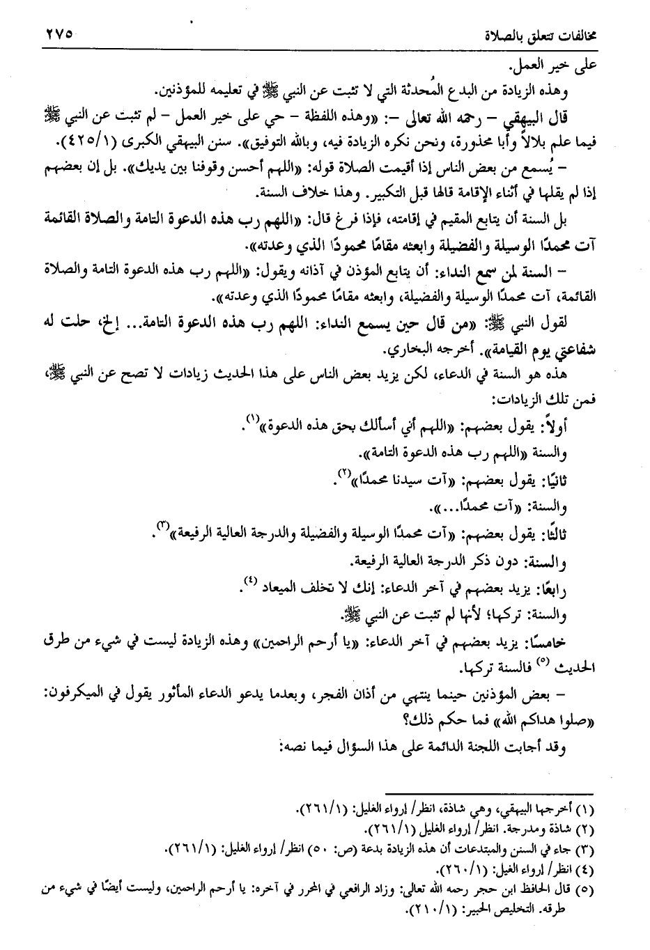 وهذه الزيادة من البدع المُحدثة التي لا تثبت عن النبي -صَلَّى اللَّهُ عَلَيْهِ وَسَلَّمَ- في تعليمه للمؤذنين.