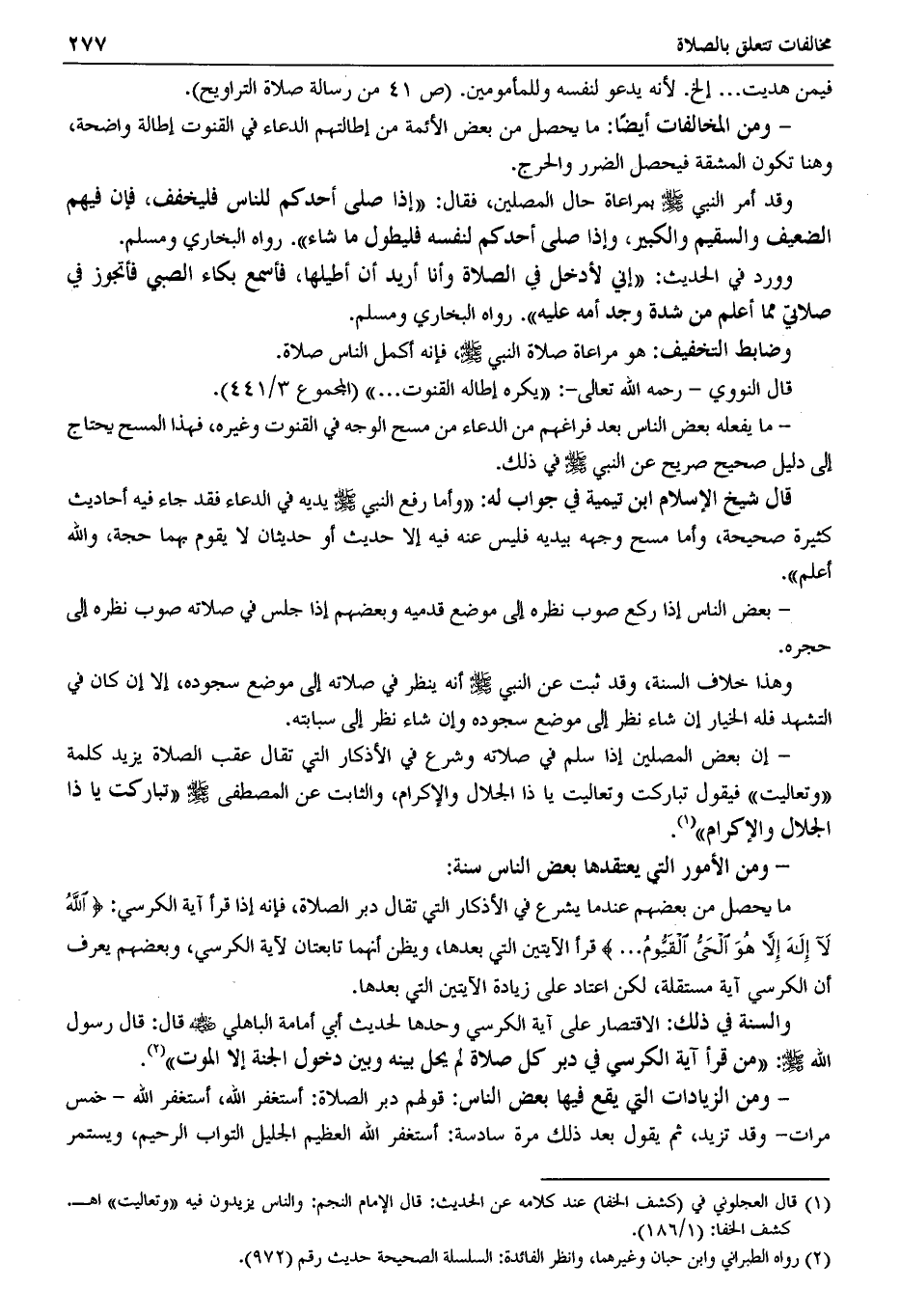 - ومن المخالفات أيضًا: ما يحصل من بعض الأئمة من إطالتهم الدعاء في القنوت إطالة واضحة، وهنا تكون المشقة فيحصل الضرر والحرج.