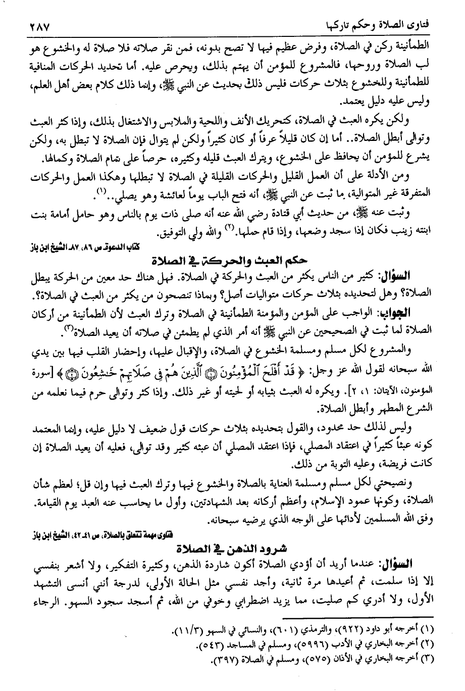 الجواب: الواجب على المؤمن والمؤمنة الطمأنينة في الصلاة وترك العبث لأن الطمأنينة من أركان الصلاة لما ثبت في الصحيحين عن النبي -صَلَّى اللَّهُ عَلَيْهِ وَسَلَّمَ- أنه أمر الذي لم يطمئن في صلاته أن يعيد الصلاة (¬3).
