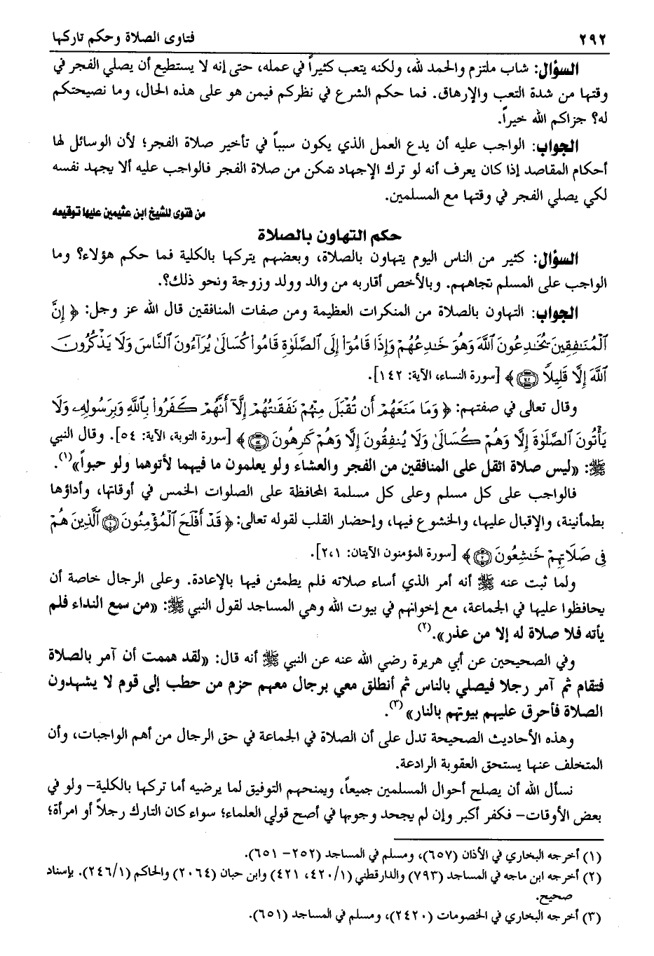 وهذه الأحاديث الصحيحة تدل على أن الصلاة في الجماعة في حق الرجال من أهم الواجبات، وأن المتخلف عنها يستحق العقوبة الرادعة.