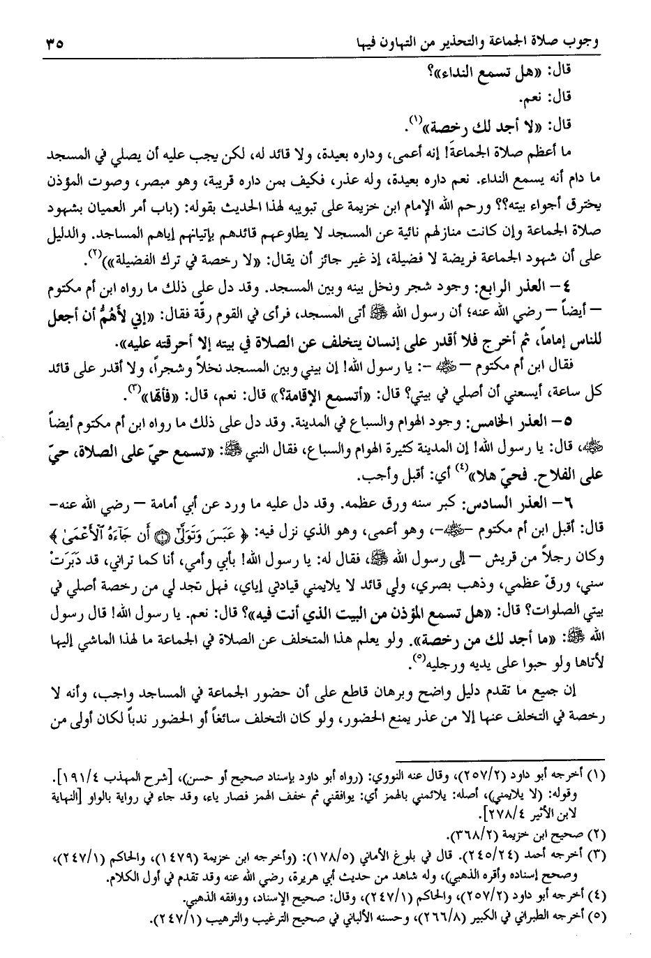 ما أعظم صلاة الجماعة! إنه أعمى، وداره بعيدة، ولا قائد له، لكن يجب عليه أن يصلي في المسجد ما دام أنه يسمع النداء. نعم داره بعيدة، وله عذر، فكيف بمن داره قريبة، وهو مبصر، وصوت المؤذن يخترق أجواء بيته؟؟ ورحم الله الإمام ابن خزيمة على تبويبه لهذا الحديث بقوله: (باب أمر العميان بشهود صلاة الجماعة وإن كانت منازلهم نائية عن المسجد لا يطاوعهم قائدهم بإتيانهم إياهم المساجد. والدليل على أن شهود الجماعة فريضة لا فضيلة، إذ غير جائز أن يقال: "لا رخصة في ترك الفضيلة") (¬2).