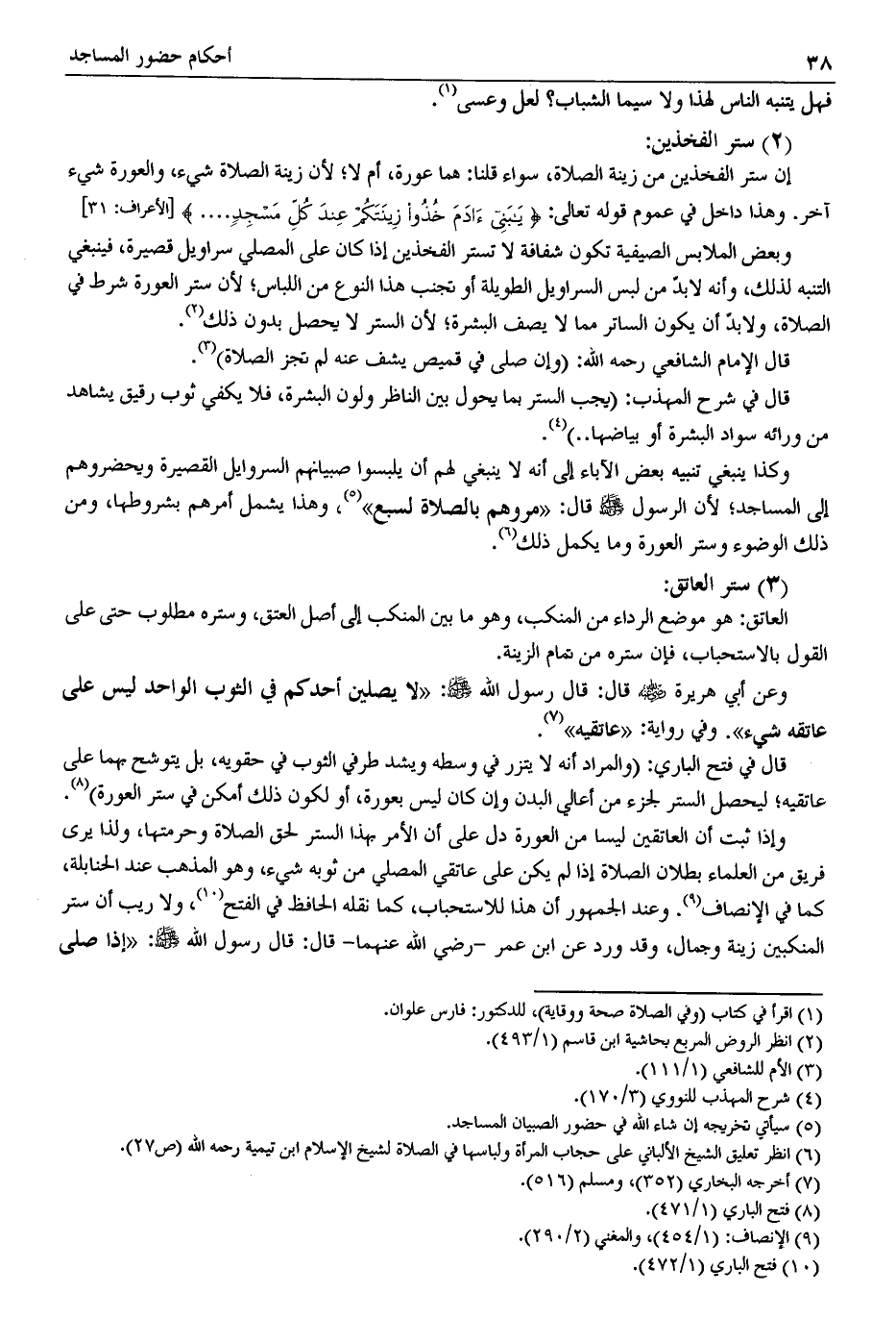 وكذا ينبغي تنبيه بعض الآباء إلى أنه لا ينبغي لهم أن يلبسوا صبيانهم السروايل القصيرة ويحضروهم إلى المساجد؛ لأن الرسول -صَلَّى اللَّهُ عَلَيْهِ وَسَلَّمَ- قال: "مروهم بالصلاة لسبع" (¬5)، وهذا يشمل أمرهم بشروطها، ومن ذلك الوضوء وستر العورة وما يكمل ذلك (¬6).