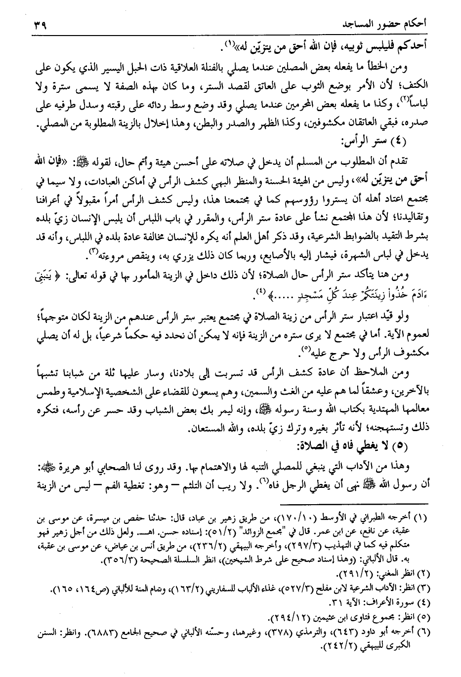وهذا من الآداب التي ينبغي للمصلي التنبه لها والاهتمام بها. وقد روى لنا الصحابي أبو هريرة -رضي الله عنه-: أن رسول الله -صَلَّى اللَّهُ عَلَيْهِ وَسَلَّمَ- نهى أن يغطي الرجل فاه (¬6). ولا ريب أن التلثم -وهو: تغطية الفم- ليس من الزينة