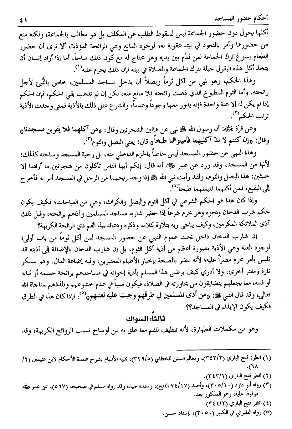 إن شارب الدخان داخل تحت عموم النهي عن حضور المسجد لمن أكل ثومًا من باب أولى؛ لوجود العلة وهي الأذية بصورة أعظم من أذية أكل الثوم، بل إن شارب الدخان بالإضافة إلى أذيته قد تلبس بأمر محرم مصرًّا عليه، لأنه مضر بالصحة بإخبار الأطباء المعتبرين، وفيه إضاعة المال، وهو مسكر تارة ومفتر أخرى، ولا أدري كيف يرضى هذا المسلم بأذية إخوانه في مساجدهم برائحة جسمه أو ثيابه أو فمه، مما يجعلهم يتضايقون من مجاورته في الصلاة، فيكون سببًا في عدم خشوعهم وتلذذهم بمناجاة الله تعالى، وقد قال النبي -صَلَّى اللَّهُ عَلَيْهِ وَسَلَّمَ-: "من أذى المسلمين في طرقهم وجبت عليه لعنتهم" (¬5)، فإذا كان هذا في الطرق فكيف يكون الإيذاء في المساجد؟؟