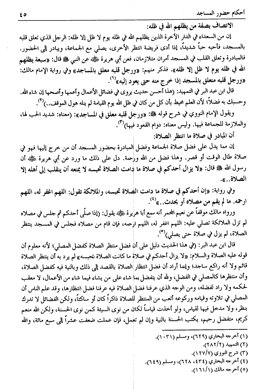 ويقول الإمام النووي في شرح قوله -صَلَّى اللَّهُ عَلَيْهِ وَسَلَّمَ-: "ورجل قلبه معلق في المساجد": (معناه: شديد الحب لها، والملازمة للجماعة فيها. وليس معناه: دوام القعود فيها) (¬3).