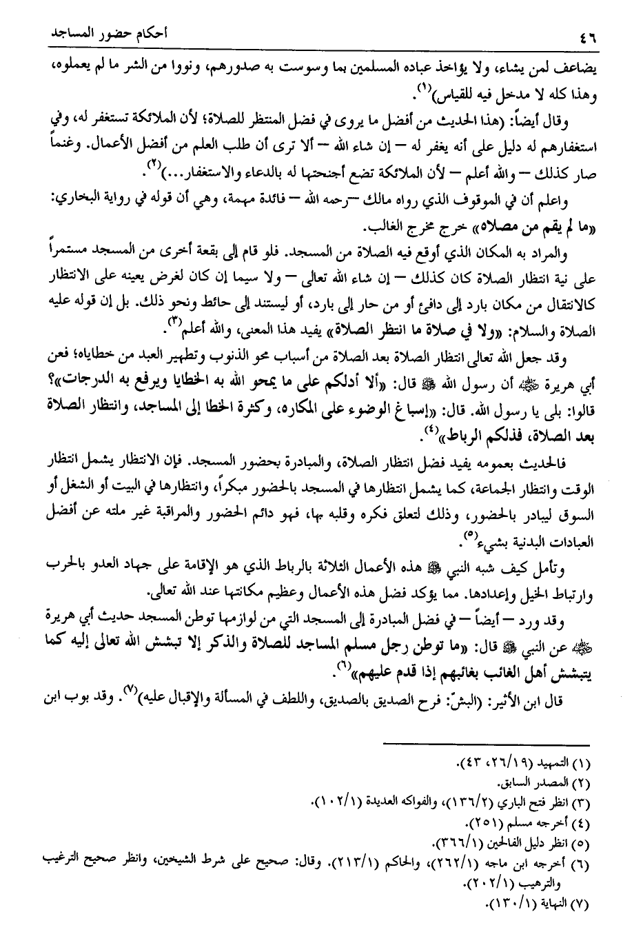 فالحديث بعمومه يفيد فضل انتظار الصلاة، والمبادرة بحضور المسجد. فإن الانتظار يشمل انتظار الوقت وانتظار الجماعة، كما يشمل انتظارها في المسجد بالحضور مبكرًا، وانتظارها في البيت أو الشغل أو السوق ليبادر بالحضور، وذلك لتعلق فكره وقلبه بها، فهو دائم الحضور والمراقبة غير ملته عن أفضل العبادات البدنية بشيء (¬5).