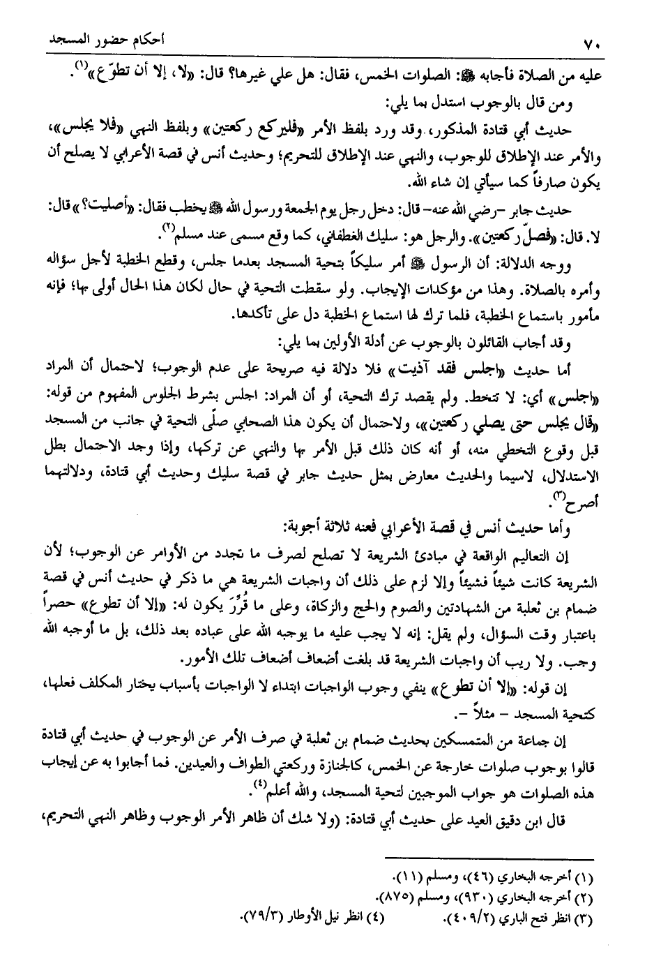 إن جماعة من المتمسكين بحديث ضمام بن ثعلبة في صرف الأمر عن الوجوب في حديث أبي قتادة قالوا بوجوب صلوات خارجة عن الخمس، كالجنازة وركعتي الطواف والعيدين. فما أجابوا به عن إيجاب هذه الصلوات هو جواب الموجبين لتحية المسجد، والله أعلم (¬4).