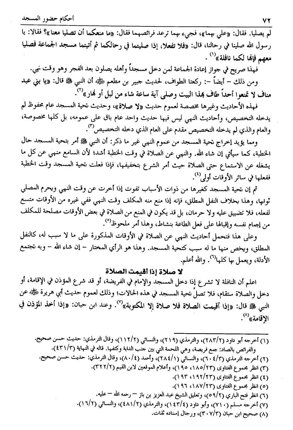 ومما يؤيد إخراج تحية المسجد من عموم النهي غير ما ذكر: أن النبي -صَلَّى اللَّهُ عَلَيْهِ وَسَلَّمَ- أمر بتحية المسجد حال الخطبة، كما سيأتي إن شاء الله. والنهي عن الصلاة في وقت الخطبة أشد؛ لأن السامع منهي عن كل ما يشغله عن الاستماع حتى الصلاة حيث أمر الشرع بتخفيفها، فإذا فعلت تحية المسجد وقت الخطبة ففعلها في سائر الأوقات أولى (¬4).