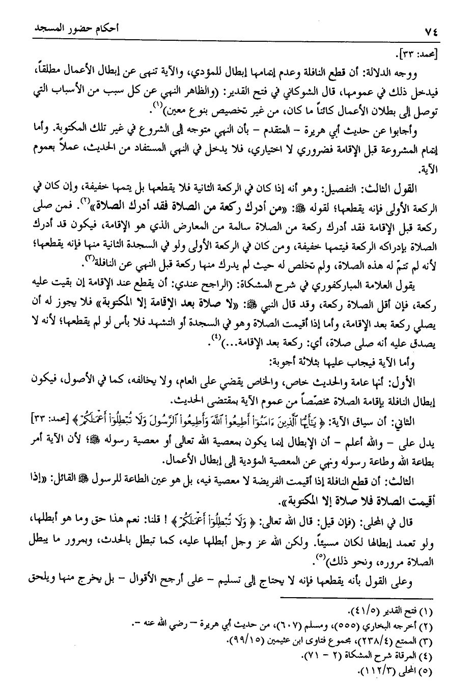 الثالث: أن قطع النافلة إذا أقيمت الفريضة لا معصية فيه، بل هو عين الطاعة للرسول -صَلَّى اللَّهُ عَلَيْهِ وَسَلَّمَ- القائل: "إذا أقيمت الصلاة فلا صلاة إلا المكتوبة".