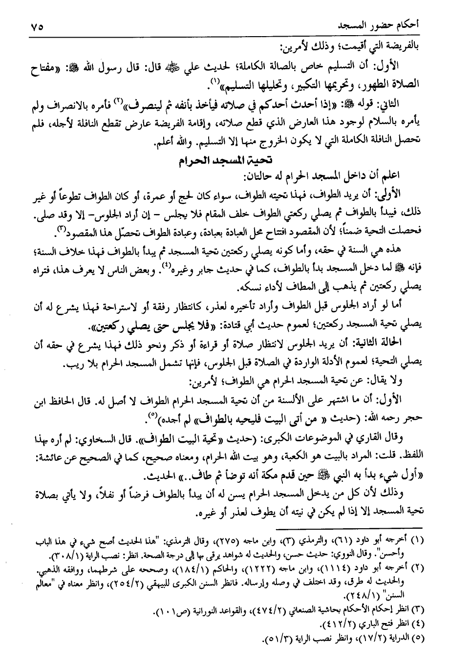 الأول: أن ما اشتهر على الألسنة من أن تحية المسجد الحرام الطواف لا أصل له. قال الحافظ ابن حجر رحمه الله: (حديث "من أتى البيت فليحيه بالطواف" لم أجده) (¬5).