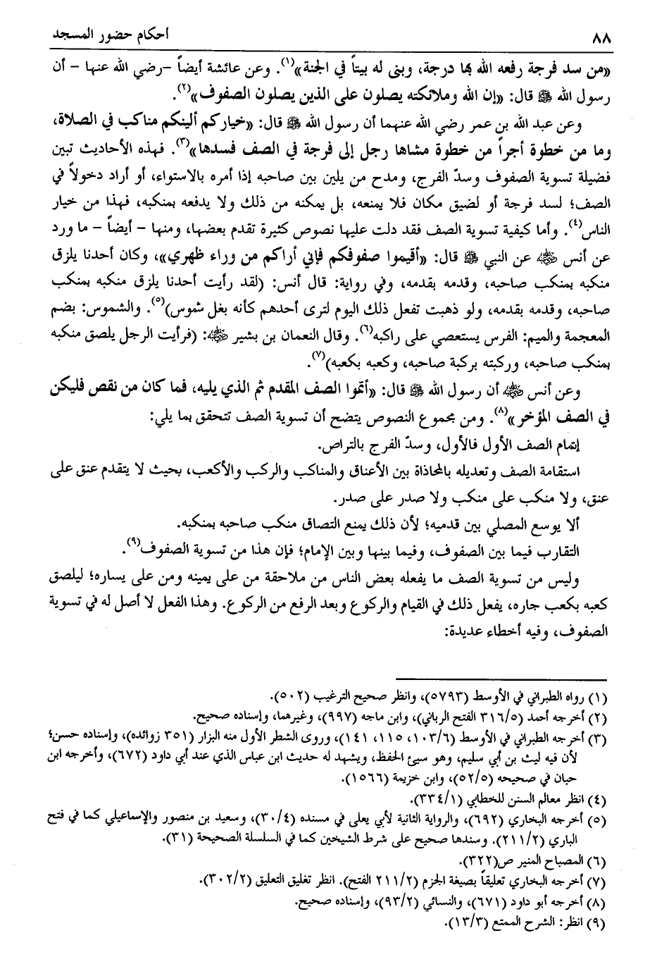وعن أنس -رضي الله عنه- أن رسول الله -صَلَّى اللَّهُ عَلَيْهِ وَسَلَّمَ- قال: "أتموا الصف المقدم ثم الذي يليه، فما كان من نقص فليكن في الصف المؤخر" (¬8). ومن مجموع النصوص يتضح أن تسوية الصف تتحقق بما يلي: