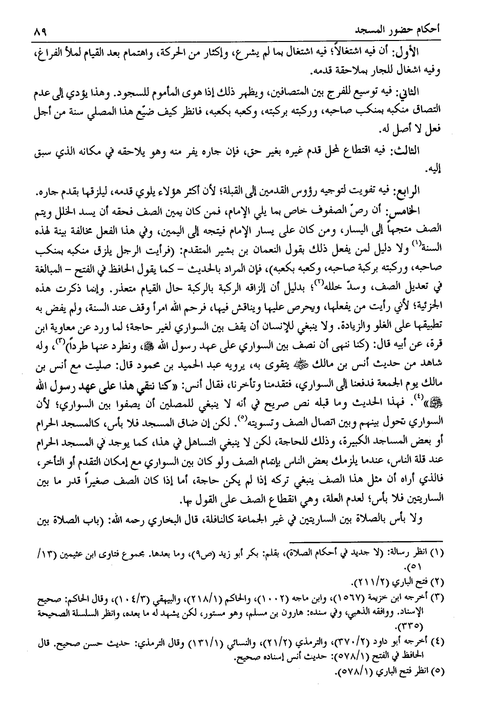 الخامس: أن رصّ الصفوف خاص بما يلي الإمام، فمن كان يمين الصف فحقه أن يسد الخلل ويتم الصف متجهًا إلى اليسار، ومن كان على يسار الإمام فيتجه إلى اليمين، وفي هذا الفعل مخالفة بينة لهذه السنة (¬1) ولا دليل لمن يفعل ذلك بقول النعمان بن بشير المتقدم: (فرأيت الرجل يلزق منكبه بمنكب صاحبه، وركبته بركبة صاحبه، وكعبه بكعبه)، فإن المراد بالحديث -كما يقول الحافظ في الفتح- المبالغة في تعديل الصف، وسدّ خلله (¬2)؛ بدليل أن إلزاقه الركبة بالركبة حال القيام متعذر. وإنما ذكرت هذه الجزئية؛ لأني رأيت من يفعلها، ويحرص عليها ويناقش فيها، فرحم الله امرأ وقف عند السنة، ولم يفض به تطبيقها على الغلو والزيادة. ولا ينبغي للإنسان أن يقف بين السواري لغير حاجة؛ لما ورد عن معاوية ابن قرة، عن أبيه قال: (كنا ننهى أن نصف بين السواري على عهد رسول الله -صَلَّى اللَّهُ عَلَيْهِ وَسَلَّمَ-، ونطرد عنها طردًا) (¬3)، وله شاهد من حديث أنس بن مالك -رضي الله عنه- يتقوى به، يرويه عبد الحميد بن محمود قال: صليت مع أنس بن مالك يوم الجمعة فدفعنا إلى السواري، فتقدمنا وتأخرنا، فقال أنس: "كنا نتقي هذا على عهد رسول الله -صَلَّى اللَّهُ عَلَيْهِ وَسَلَّمَ-" (¬4). فهذا الحديث وما قبله نص صريح في أنه لا ينبغي للمصلين أن يصفوا بين السواري؛ لأن السواري تحول بينهم وبين اتصال الصف وتسويته (¬5). لكن إن ضاق المسجد فلا بأس، كالمسجد الحرام أو بعض المساجد الكبيرة، وذلك للحاجة، لكن لا ينبغي التساهل في هذا، كما يوجد في المسجد الحرام عند قلة الناس، عندما يلزمك بعض الناس بإتمام الصف ولو كان بين السواري مع إمكان التقدم أو التأخر، فالذي أراه أن مثل هذا الصف ينبغي تركه إذا لم يكن حاجة، أما إذا كان الصف صغيرًا قدر ما بين الساريتين فلا بأس؛ لعدم العلة، وهي انقطاع الصف على القول بها.