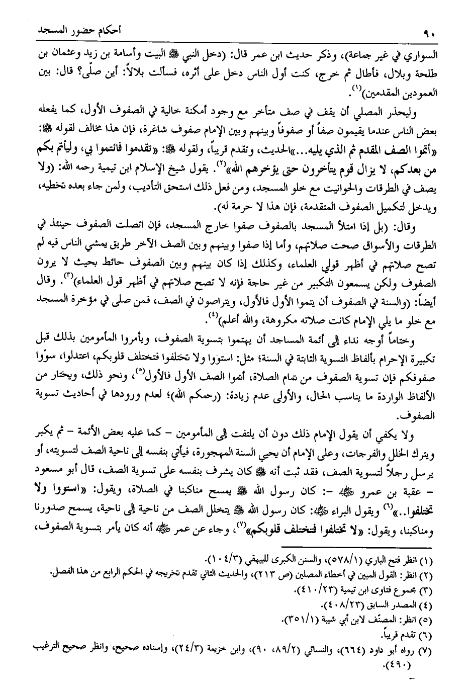وختامًا أوجه نداء إلى أئمة المساجد أن يهتموا بتسوية الصفوف، ويأمروا المأمومين بذلك قبل تكبيرة الإحرام بألفاظ التسوية الثابتة في السنة؛ مثل: استووا ولا تختلفوا فتختلف قلوبكم، اعتدلوا، سوّوا صفوفكم فإن تسوية الصفوف من تمام الصلاة، أتموا الصف الأول فالأول (¬5)، ونحو ذلك، ويختار من الألفاظ الواردة ما يناسب الحال، والأولى عدم زيادة: (رحمكم الله)؛ لعدم ورودها في أحاديث تسوية الصفوف.