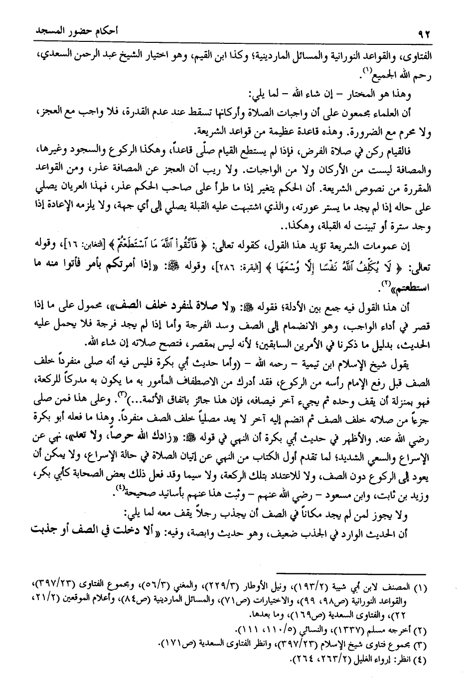 يقول شيخ الإسلام ابن تيمية -رحمه الله- (وأما حديث أبي بكرة فليس فيه أنه صلى منفردًا خلف الصف قبل رفع الإمام رأسه من الركوع، فقد أدرك من الاصطفاف المأمور به ما يكون به مدركًا للركعة، فهو بمنزلة أن يقف وحده ثم يجيء آخر فيصافه، فإن هذا جائز باتفاق الأئمة ... ) (¬3). وعلى هذا فمن صلى جزءًا من صلاته خلف الصف ثم انضم إليه آخر لا يعد مصليًا خلف الصف منفردًا. وهذا ما فعله أبو بكرة رضي الله عنه. والأظهر في حديث أبي بكرة أن النهي في قوله -صَلَّى اللَّهُ عَلَيْهِ وَسَلَّمَ-: "زادك الله حرصًا، ولا تعد"، نهي عن الإسراع والسعي الشديد؛ لما تقدم أول الكتاب من النهي عن إتيان الصلاة في حالة الإسراع، ولا يمكن أن يعود إلى الركوع دون الصف، ولا للاعتداد بتلك الركعة، ولا سيما وقد فعل ذلك بعض الصحابة كأبي بكر، وزيد بن ثابت، وابن مسعود -رضي الله عنهم- وثبت هذا عنهم بأسانيد صحيحة (¬4).