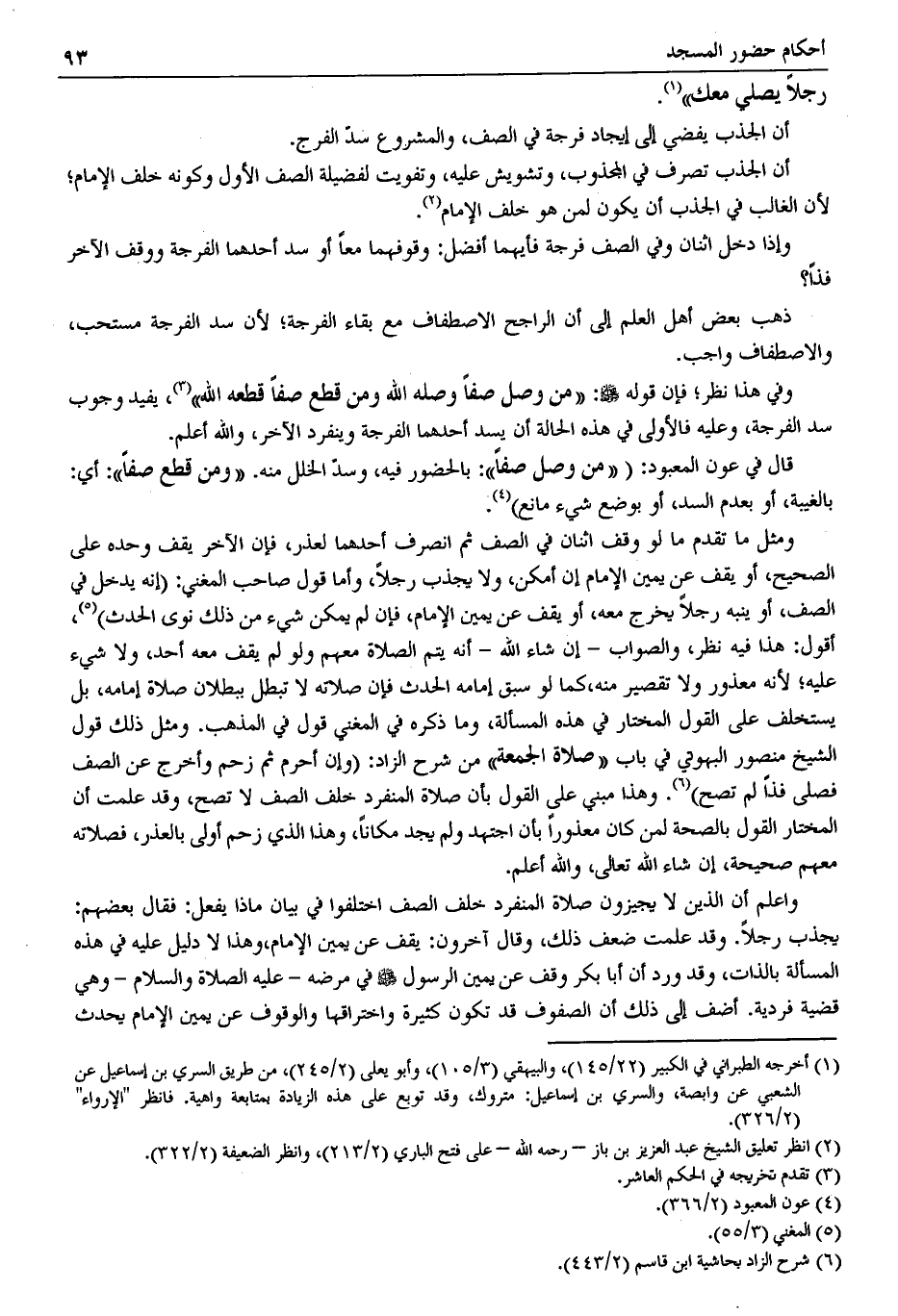 واعلم أن الذين لا يجيزون صلاة المنفرد خلف الصف اختلفوا في بيان ماذا يفعل: فقال بعضهم: يجذب رجلًا. وقد علمت ضعف ذلك، وقال آخرون: يقف عن يمين الإمام، وهذا لا دليل عليه في هذه المسألة بالذات، وقد ورد أن أبا بكر وقف عن يمين الرسول -صَلَّى اللَّهُ عَلَيْهِ وَسَلَّمَ- في مرضه -عليه الصلاة والسلام- وهي قضية فردية. أضف إلى ذلك أن الصفوف قد تكون كثيرة واختراقها والوقوف عن يمين الإمام يحدث