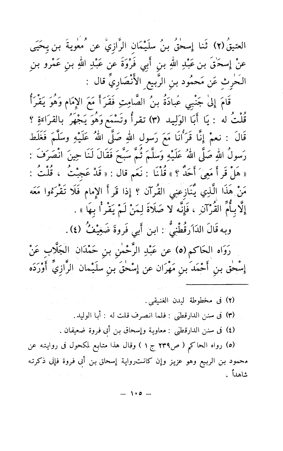 الْعَتِيق ثَنَا اسحق بْنُ سُلَيْمَانَ الرَّازِيُّ عَنْ مُعَاوِيَةَ بن يحيى عَن اسحق بْنِ عَبْدِ اللَّهِ بْنِ أَبِي فَرْوَةَ عَنْ عَبْدِ اللَّهِ بْنِ عَمْرِو بْنِ الْحَارِثِ عَنْ مَحْمُودِ بْنِ الرَّبِيعِ الأَنْصَارِيِّ قَالَ قَامَ إِلَى جَنْبِي عِبَادَةُ بْنُ الصَّامِتِ فَقَرَأَ مَعَ الإِمَامِ وَهُوَ يَقْرَأُ قُلْتُ لَهُ يَا أَبَا الْوَلِيدِ تَقْرَأُ وَتَسْمَعُ وَهُوَ يَجْهَرُ بِالْقِرَاءَةِ قَالَ نَعَمْ إِنَّا قَرَأْنَا مَعَ رَسُولَ اللَّهِ صَلَّى اللَّهُ عَلَيْهِ وَسَلَّمَ فَغَلِطَ رَسُولُ اللَّهِ صَلَّى اللَّهُ عَلَيْهِ وَسَلَّمَ ثُمَّ سَبَّحَ فَقَالَ لَنَا حِينَ انْصَرَفَ هَلْ قَرَأَ مَعِي أَحَدٌ قُلْنَا نَعَمْ قَالَ قَدْ عَجِبْتُ قُلْتُ مِنْ هَذَا الَّذِي يُنَازِعُنِي الْقُرْآنَ إِذَا قَرَأَ الإِمَامُ فَلا تَقْرَءُوا مَعَهُ إِلا بِأُمِّ الْقُرْآنِ فَإِنَّهُ لَا صَلاةَ لِمَنْ لَمْ يَقْرَأْ بِهَا وَبِهِ قَالَ الدَّارَقُطْنِيُّ ابْنُ أَبِي فَرْوَةَ ضَعِيفٌ رَوَاهُ الْحَاكِمُ عَنْ عَبْدِ الرَّحْمَنِ بْنِ حِمْدَانَ الْجَلابِ عَن اسحق بْنِ أَحْمَدَ بْنِ مِهْرَانَ عَنْ اسحق بْنِ سُلَيْمَانَ الرَّازِيِّ أَوْرَدَهُ