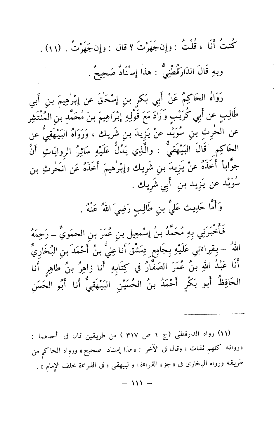 كُنْتُ أَنَا قُلْتُ وَإِنْ جَهَرْتَ قَالَ وَإِنْ جَهَرْتُ وَبِهِ قَالَ الدَّارَقُطْنِيُّ هَذَا إِسْنَادٌ صَحِيحٌ رَوَاهُ الْحَاكِمُ عَنْ أَبِي بَكْرِ بْنِ اسحق عَنْ إِبْرَاهِيمَ بْنِ أَبِي طَالِبٍ عَنْ أَبِي كُرَيْبٍ وَزَادَ مَعَ قَوْلِهِ إِبْرَاهِيمُ بْنُ مُحَمَّدِ بْنِ الْمُنْتَشِر عَن الْحَرْث بْنِ سُوَيْدٍ عَنْ يَزِيدَ بْنِ شَرِيكٍ وَرَوَاهُ الْبَيْهَقِيُّ عَنِ الْحَاكِمِ قَالَ الْبَيْهَقِيُّ وَالَّذِي يَدُلُّ عَلَيْهِ سَائِرُ الرِّوَايَاتِ أَنَّ جَوَّابًا أَخَذَهُ عَنْ يَزِيدَ بْنِ شَرِيكٍ وَإِبْرَاهِيمُ اخذه عَن انحرث بْنِ سُوَيْدٍ عَنْ يَزِيدَ بْنِ أَبِي شَرِيكٍ وَأَمَّا حَدِيثُ عَلِيِّ بن طَالِبٍ رَضِيَ اللَّهُ عَنْهُ فَأَخْبَرَنِي بِهِ مُحَمَّدُ بْنُ إِسْمَاعِيلَ بْنِ عُمَرَ بْنِ الْحَمَوِيِّ رَحِمَهُ اللَّهُ بِقِرَاءَتِي عَلَيْهِ بِجَامِعِ دِمَشْقَ أَنَا عَلِيُّ بْنُ أَحْمَدَ بْنِ الْبُخَارِيِّ أَنَا عَبْدُ اللَّهِ بْنُ عُمَرَ الصَّفَّارُ فِي كِتَابِهِ أَنَا زَاهِرُ بْنُ طَاهِرٍ أَنَا الْحَافِظُ أَبُو بَكْرٍ أَحْمَدُ بْنُ الْحُسَيْنِ الْبَيْهَقِيُّ أَنَا أَبُو الْحَسَنِ