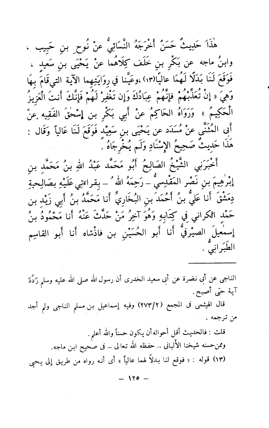 هَذَا حَدِيثٌ حَسَنٌ أَخْرَجَهُ النَّسَائِيُّ عَنْ نُوحِ بْنِ حَبِيبٍ وَابْنُ مَاجَهْ عَنْ بَكْرِ بْنِ خَلَفٍ كِلاهُمَا عَنْ يَحْيَى بْنِ سَعِيدٍ فَوَقَعَ لَنَا بَدَلا لَهُمَا عَالِيًّا وعينا فِي رواياتهما الآيَةُ الَّتِي قَامَ بِهَا وَهِيَ إِنْ تُعَذِّبْهُمْ فَإِنَّهُمْ عِبَادُكَ وَإِنْ تَغْفِرْ لَهُمْ فَإِنَّكَ أَنْتَ الْعَزِيزُ الْحَكِيمُ وَرَوَاهُ الْحَاكِمُ عَنْ أَبِي بكر بن اسحق الْفَقِيهِ عَنْ أَبِي الْمُثَنَّى عَنْ مُسَدَّدٍ عَنْ يَحْيَى بْنِ سَعِيدٍ فَوَقَعَ لَنَا عَالِيًّا وَقَالَ هَذَا حَدِيثٌ صَحِيحُ الإِسْنَادِ وَلَمْ يُخَرِّجَاهُ أَخْبَرَنِي الشَّيْخُ الصَّالِحُ أَبُو مُحَمَّدٍ عَبْدُ اللَّهِ بْنُ مُحَمَّدِ بْنِ إِبْرَاهِيمَ بْنِ نَصْرٍ الْمَقْدِسِيُّ رَحِمَهُ اللَّهُ بِقِرَاءَتِي عَلَيْهِ بِصَالِحِيَّةِ دِمَشْقَ أَنَا عَلِيُّ بْنُ أَحْمَدَ بْنِ الْبُخَارِيِّ أَنَا مُحَمَّدُ بْنُ أَبِي زَيْدِ بْنِ حَمْدٍ الْكَرَّانِيُّ فِي كِتَابِهِ وَهُوَ آخِرُ مَنْ حَدَّثَ عَنْهُ أَنَا مَحْمُودُ بْنُ إِسْمَاعِيلَ الصَّيْرَفِيُّ أَنَا أَبُو الْحُسَيْنِ بْنُ فَاذْشَاهْ أَنَا أَبُو الْقَاسِمِ الطَّبَرَانِيُّ