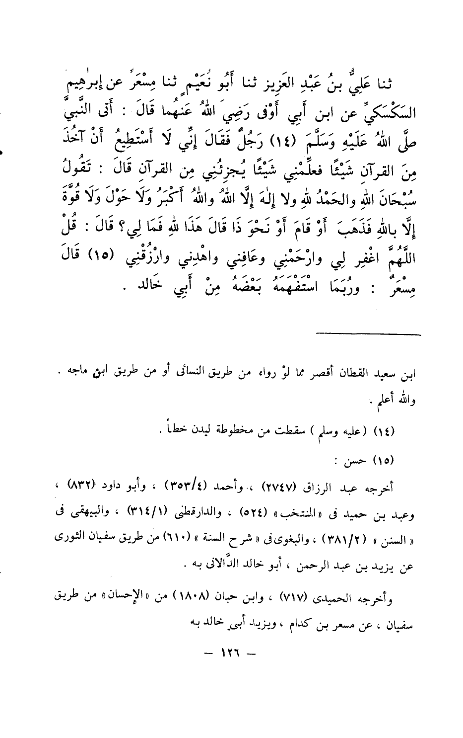 @ 127 ثَنَا عَلِيُّ بْنُ عَبْدِ الْعَزِيزِ ثَنَا أَبُو نُعَيْمٍ ثَنَا مِسْعَرٌ عَنْ إِبْرَاهِيمَ السَّكْسَكِيِّ عَنِ ابْنِ أَبِي أَوْفَى رَضِيَ اللَّهُ عَنْهُمَا قَالَ أَتَى النَّبِيُّ صَلَّى اللَّهُ عَلَيْهِ وَسَلَّمَ رَجُلٌ فَقَالَ إِنِّي لَا أَسْتَطِيعُ أَنْ آخُذَ مِنَ الْقُرْآنِ شَيْئًا فَعَلِّمْنِي شَيْئًا يُجْزِئُنِي مِنَ الْقُرْآنِ قَالَ تَقُولُ سُبْحَانَ اللَّهِ وَالْحَمْدُ للَّهِ وَلا إِلَهَ إِلا اللَّهُ وَاللَّهُ أَكْبَرُ وَلا حَوْلَ وَلا قُوَّةَ إِلا بِاللَّهِ فَذَهَبَ أَوْ قَامَ أَوْ نَحْوَ ذَا قَالَ هَذَا للَّهِ فَمَا لِي قَالَ قُلِ اللَّهُمَّ اغْفِرْ لِي وَارْحَمْنِي وَعَافِنِي وَاهْدِنِي وَارْزُقْنِي قَالَ مِسْعَرٌ وَرُبَّمَا اسْتَفْهَمَهُ بَعْضَهُ مِنْ أَبِي خَالِدٍ