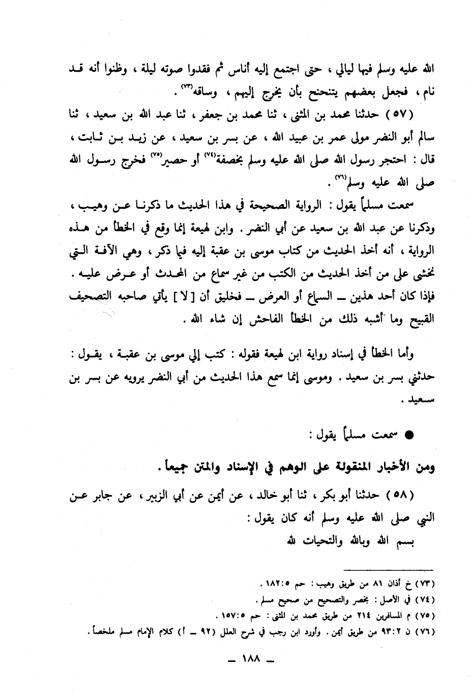 سَمِعت مُسلما يَقُول الرِّوَايَة الصَّحِيحَة فِي هَذَا الحَدِيث مَا ذكرنَا عَن وهيب وَذكرنَا عَن عبد الله بن سعيد عَن أبي النَّضر وَابْن لَهِيعَة انما وَقع فِي الْخَطَأ من هَذِه الرِّوَايَة أَنه أَخذ الحَدِيث من كتاب مُوسَى بن عقبَة اليه فِيمَا ذكر وَهِي الآفة الَّتِي نخشى على من أَخذ الحَدِيث من الْكتب من غير سَماع من الْمُحدث أَو عرض عَلَيْهِ فَإِذا كَانَ أحد هذَيْن السماع أَو الْعرض فخليق أَن لَا يَأْتِي صَاحبه التَّصْحِيف الْقَبِيح وَمَا أشبه ذَلِك من الْخَطَأ الْفَاحِش ان شَاءَ الله وَأما الْخَطَأ فِي اسناد رِوَايَة ابْن لَهِيعَة فَقَوله كتب الي مُوسَى بن عقبَة يَقُول حَدثنِي بسر بن سعيد ومُوسَى انما سمع هَذَا الحَدِيث من أبي النَّضر يرويهِ عَن بسر بن سعيد