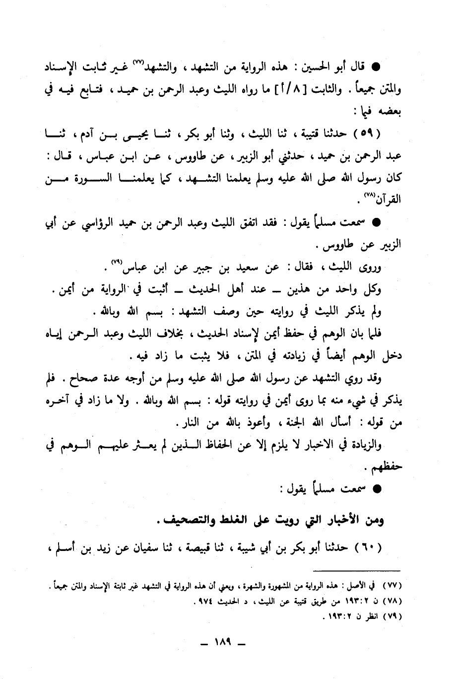 قَالَ أَبُو الْحُسَيْن هَذِه الرِّوَايَة من التَّشَهُّد وَالتَّشَهُّد غير ثَابت الاسناد والمتن جَمِيعًا وَالثَّابِت مَا رَوَاهُ اللَّيْث وَعبد الرَّحْمَن بن حميد فتابع فِيهِ فِي بعضه فِيمَا
