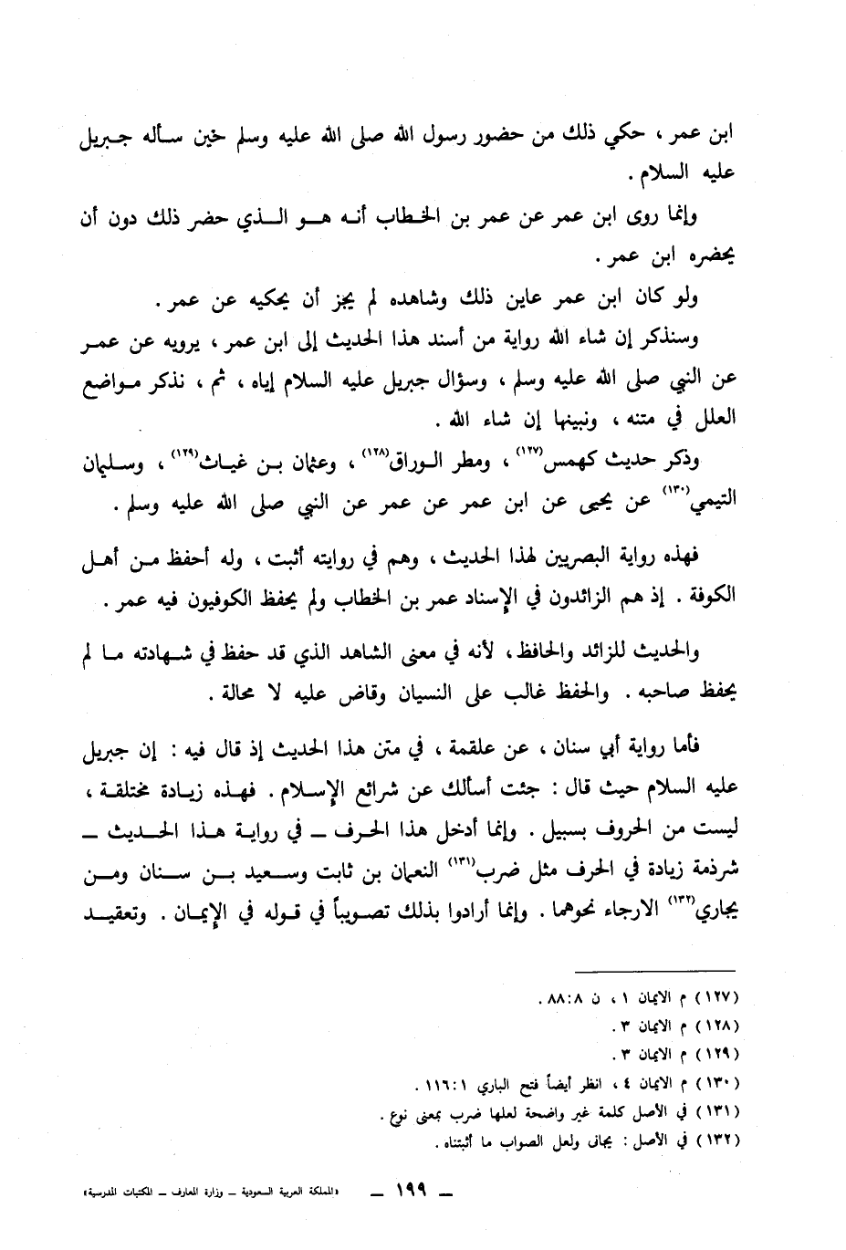 ابْن عمر حُكيَ ذَلِك من حُضُور رَسُول الله صلى الله عَلَيْهِ وَسلم حِين سَأَلَهُ جِبْرِيل عَلَيْهِ السَّلَام وانما روى ابْن عمر عَن عمر بن الْخطاب أَنه هُوَ الَّذِي حضر ذَلِك دون أَن يحضرهُ ابْن عمر وَلَو كَانَ ابْن عمر عاين ذَلِك وَشَاهده لم يجز أَن يحكيه عَن عمر وَسَنذكر ان شَاءَ الله رِوَايَة من أسْند هَذَا الحَدِيث الى ابْن عمر يرويهِ عَن عمر عَن النَّبِي صلى الله عَلَيْهِ وَسلم وسؤال جِبْرِيل عَلَيْهِ السَّلَام اياه ثمَّ نذْكر مَوَاضِع الْعِلَل فِي مَتنه ونبينها ان شَاءَ الله وَذكر حَدِيث كهمس ومطر الْوراق وَعُثْمَان بن غياث وَسليمَان التَّيْمِيّ عَن يحيى عَن ابْن عمر عَن عمر عَن النَّبِي صلى الله عَلَيْهِ وَسلم فَهَذِهِ رِوَايَة الْبَصرِيين لهَذَا الحَدِيث وهم فِي رِوَايَته أثبت وَله أحفظ من أهل الْكُوفَة إِذْ هم الزائدون فِي الاسناد عمر بن الْخطاب وَلم يحفظ الْكُوفِيُّونَ فِيهِ عمر والْحَدِيث للزائد والحافظ لانه فِي معنى الشَّاهِد الَّذِي قد حفظ فِي شَهَادَته مَا لم يحفظ صَاحبه وَالْحِفْظ غَالب على النسْيَان وقاض عَلَيْهِ لَا محَالة