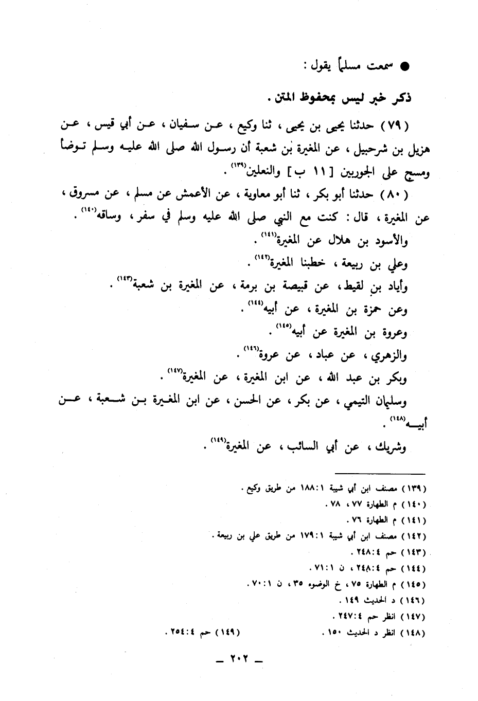 80 - حَدثنَا أَبُو بكر ثَنَا أَبُو مُعَاوِيَة عَن الاعمش عَن مُسلم عَن مَسْرُوق عَن الْمُغيرَة قَالَ كنت مَعَ النَّبِي صلى الله عَلَيْهِ وَسلم فِي سفر وَسَاقه والاسود بن هِلَال عَن الْمُغيرَة وَعلي بن ربيعَة خَطَبنَا الْمُغيرَة وأياد بن لَقِيط عَن قبيصَة بن برمة عَن الْمُغيرَة بن شُعْبَة وَعَن حَمْزَة بن الْمُغيرَة عَن أَبِيه وَعُرْوَة بن الْمُغيرَة عَن أَبِيه وَالزهْرِيّ عَن عباد عَن عُرْوَة وَبكر بن عبد الله عَن ابْن الْمُغيرَة عَن الْمُغيرَة وَسليمَان التَّيْمِيّ عَن بكر عَن الْحسن عَن ابْن الْمُغيرَة بن شُعْبَة عَن أَبِيه وَشريك عَن أبي السَّائِب عَن الْمُغيرَة