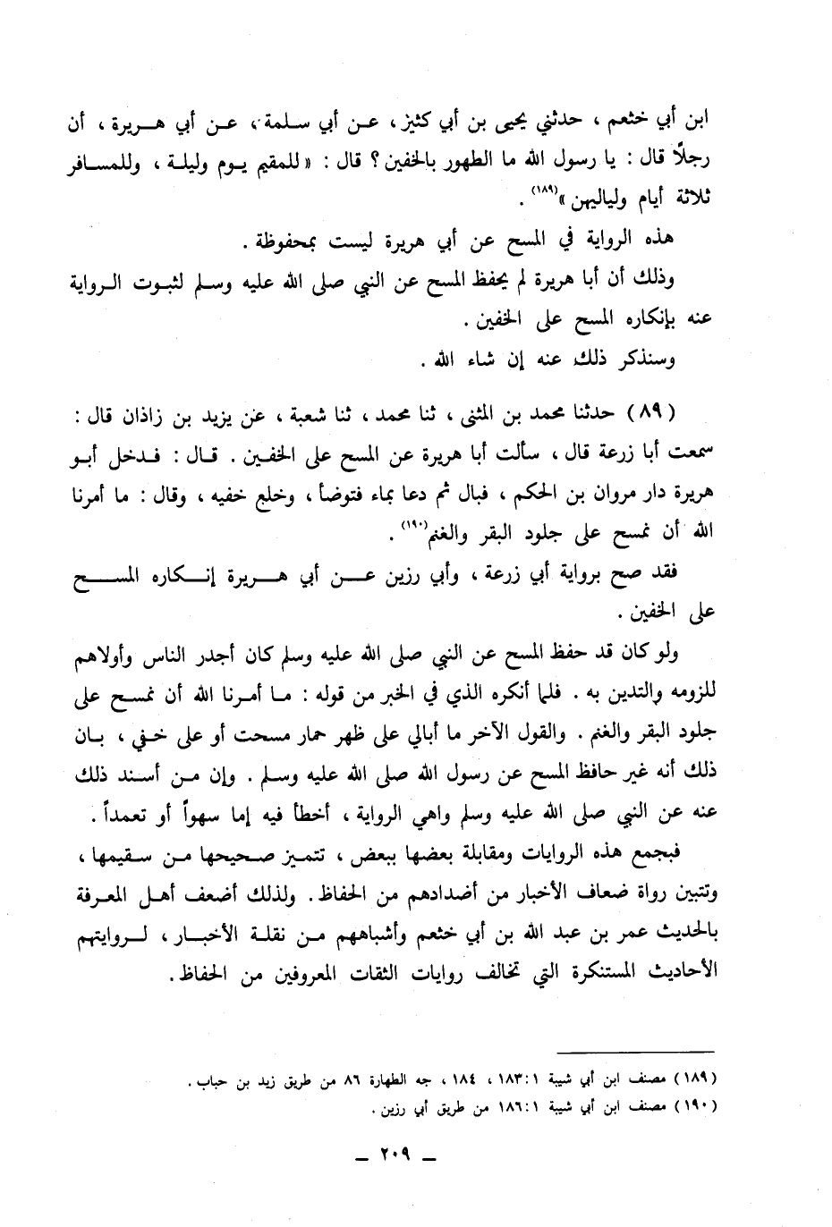 89 - حَدثنَا مُحَمَّد بن الْمثنى ثَنَا مُحَمَّد ثَنَا شُعْبَة عَن يزِيد بن زَاذَان قَالَ سَمِعت أَبَا زرْعَة قَالَ سَأَلت أَبَا هُرَيْرَة عَن الْمسْح على الْخُفَّيْنِ قَالَ فَدخل أَبُو هُرَيْرَة دَار مَرْوَان بن الحكم فَبَال ثمَّ دَعَا بِمَاء فَتَوَضَّأ وخلع خفيه وَقَالَ مَا أمرنَا الله أَن نمسح على جُلُود الْبَقر وَالْغنم فقد صَحَّ بِرِوَايَة أبي زرْعَة وَأبي رزين عَن أبي هُرَيْرَة انكاره الْمسْح على الْخُفَّيْنِ وَلَو كَانَ قد حفظ الْمسْح عَن النَّبِي صلى الله عَلَيْهِ وَسلم كَانَ أَجْدَر النَّاس وأولاهم للزومه والتدين بِهِ فَلَمَّا أنكرهُ الَّذِي فِي الْخَبَر من قَوْله مَا أمرنَا الله أَن نمسح على جُلُود الْبَقر وَالْغنم وَالْقَوْل الآخر مَا أُبَالِي على ظهر حمَار مسحت أَو على خَفِي بَان ذَلِك أَنه غير حَافظ الْمسْح عَن رَسُول الله صلى الله عَلَيْهِ وَسلم وان من أسْند ذَلِك عَنهُ عَن النَّبِي صلى الله عَلَيْهِ وَسلم واهي الرِّوَايَة أَخطَأ فِيهِ اما سَهوا أَو تعمدا فبجمع هَذِه الرِّوَايَات ومقابلة بَعْضهَا بِبَعْض تتَمَيَّز صحيحها من سقيمها وتتبين رُوَاة ضِعَاف الاخبار من أضدادهم من الْحفاظ وَلذَلِك أَضْعَف أهل الْمعرفَة بِالْحَدِيثِ عمر بن عبد الله بن أبي خثعم وأشباهم من نقلة الاخبار لروايتهم الاحاديث المستنكرة الَّتِي تخَالف رِوَايَات الثِّقَات المعروفين من الْحفاظ