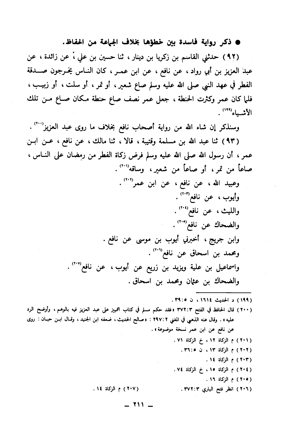 92 - حَدثنِي الْقَاسِم بن زَكَرِيَّا بن دِينَار ثَنَا حُسَيْن بن عَليّ عَن زَائِدَة عَن عبد الْعَزِيز بن أبي رواد عَن نَافِع عَن أبن عمر كَانَ النَّاس يخرجُون صَدَقَة الْفطر فِي عهد النَّبِي صلى الله عَلَيْهِ وَسلم صَاع شعير أَو تمر أَو سلت أَو زبيب فَلَمَّا كَانَ عمر وَكَثُرت الْحِنْطَة جعل عمر نصف صَاع حِنْطَة مَكَان صَاع من تِلْكَ الاشياء وَسَنذكر ان شَاءَ الله من رِوَايَة أَصْحَاب نَافِع بِخِلَاف مَا روى عبد الْعَزِيز