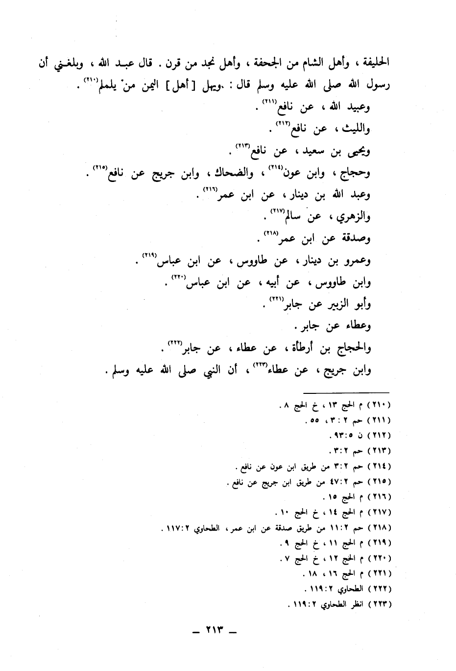 الحليفة وَأهل الشَّام من الْجحْفَة وَأهل نجد من قرن قَالَ عبد الله وَبَلغنِي أَن رَسُول الله صلى الله عَلَيْهِ وَسلم قَالَ ويهل أهل الْيمن من يَلَمْلَم وَعبيد الله عَن نَافِع وَاللَّيْث عَن نَافِع وَيحيى بن سعيد عَن نَافِع وحجاج وَابْن عون وَالضَّحَّاك وَابْن جريج عَن نَافِع وَعبد الله بن دِينَار عَن ابْن عمر وَالزهْرِيّ عَن سَالم وَصدقَة عَن ابْن عمر وَعَمْرو بن دِينَار عَن طَاوُوس عَن ابْن عَبَّاس وَابْن طَاوُوس عَن أَبِيه عَن ابْن عَبَّاس وَأَبُو الزبير عَن جَابر وَعَطَاء عَن جَابر وَالْحجاج بن أَرْطَأَة عَن عَطاء عَن جَابر وَابْن جريج عَن عَطاء أَن النَّبِي صلى الله عَلَيْهِ وَسلم