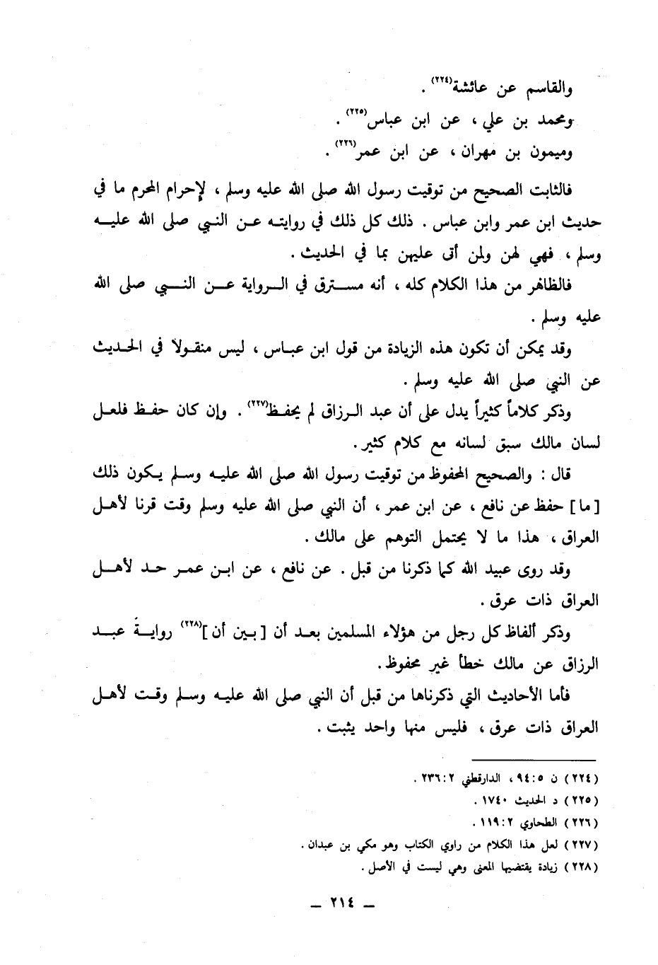 وَالقَاسِم عَن عَائِشَة وَمُحَمّد بن عَليّ عَن ابْن عَبَّاس وَمَيْمُون بن مهْرَان عَن ابْن عمر فالثابت الصَّحِيح من تَوْقِيت رَسُول الله صلى الله عَلَيْهِ وَسلم لاحرام الْمحرم مَا فِي حَدِيث ابْن عمر وَابْن عَبَّاس كل ذَلِك فِي رِوَايَته عَن النَّبِي صلى الله عَلَيْهِ وَسلم فَهِيَ لَهُنَّ وَلمن أَتَى عَلَيْهِنَّ بِمَا فِي الحَدِيث فَالظَّاهِر من هَذَا الْكَلَام كُله أَنه مسترق فِي الرِّوَايَة عَن النَّبِي صلى الله عَلَيْهِ وَسلم وَقد يُمكن أَن تكون هَذِه الزِّيَادَة من قَول ابْن عَبَّاس لَيْسَ مَنْقُولًا فِي الحَدِيث عَن النَّبِي صلى الله عَلَيْهِ وَسلم وَذكر كلَاما كثيرا يدل على أَن عبد الرَّزَّاق لم يحفظ وان كَانَ حفظ فَلَعَلَّ لِسَان مَالك سبق لِسَانه مَعَ كَلَام كثير قَالَ وَالصَّحِيح الْمَحْفُوظ من تَوْقِيت رَسُول الله صلى الله عَلَيْهِ وَسلم يكون ذَلِك مَا حفظ عَن نَافِع عَن ابْن عمر أَن النَّبِي صلى الله عَلَيْهِ وَسلم وَقت قرنا لاهل الْعرَاق هَذَا مَا لَا يحْتَمل التَّوَهُّم على مَالك وَقد روى عبيد الله كَمَا ذكرنَا من قبل عَن نَافِع عَن ابْن عمر حد لاهل الْعرَاق ذَات عرق وَذكر أَلْفَاظ كل رجل من هَؤُلَاءِ المسمين بعد أَن بَين أَن رِوَايَة عبد الزراق عَن مَالك خطأ غير مَحْفُوظ فَأَما الاحاديث الَّتِي ذَكرنَاهَا من قبل أَن النَّبِي صلى الله عَلَيْهِ وَسلم وَقت لاهل الْعرَاق ذَات عرق فَلَيْسَ مِنْهَا وَاحِد يثبت