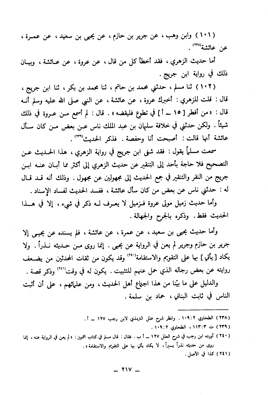 101 - وَابْن وهب عَن جرير بن حَازِم عَن يحيى بن سعيد عَن عُرْوَة عَن عَائِشَة أما حَدِيث الزُّهْرِيّ فقد أَخطَأ كل من قَالَ عَن عُرْوَة عَن عَائِشَة وَبَيَان ذَلِك فِي رِوَايَة ابْن جريج