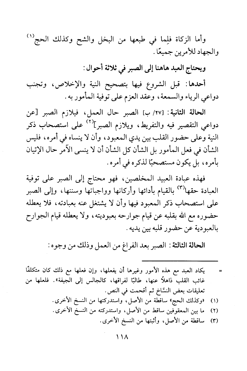 ويحتاج العبد هاهنا الى الصبر في ثلاثة أحوال: