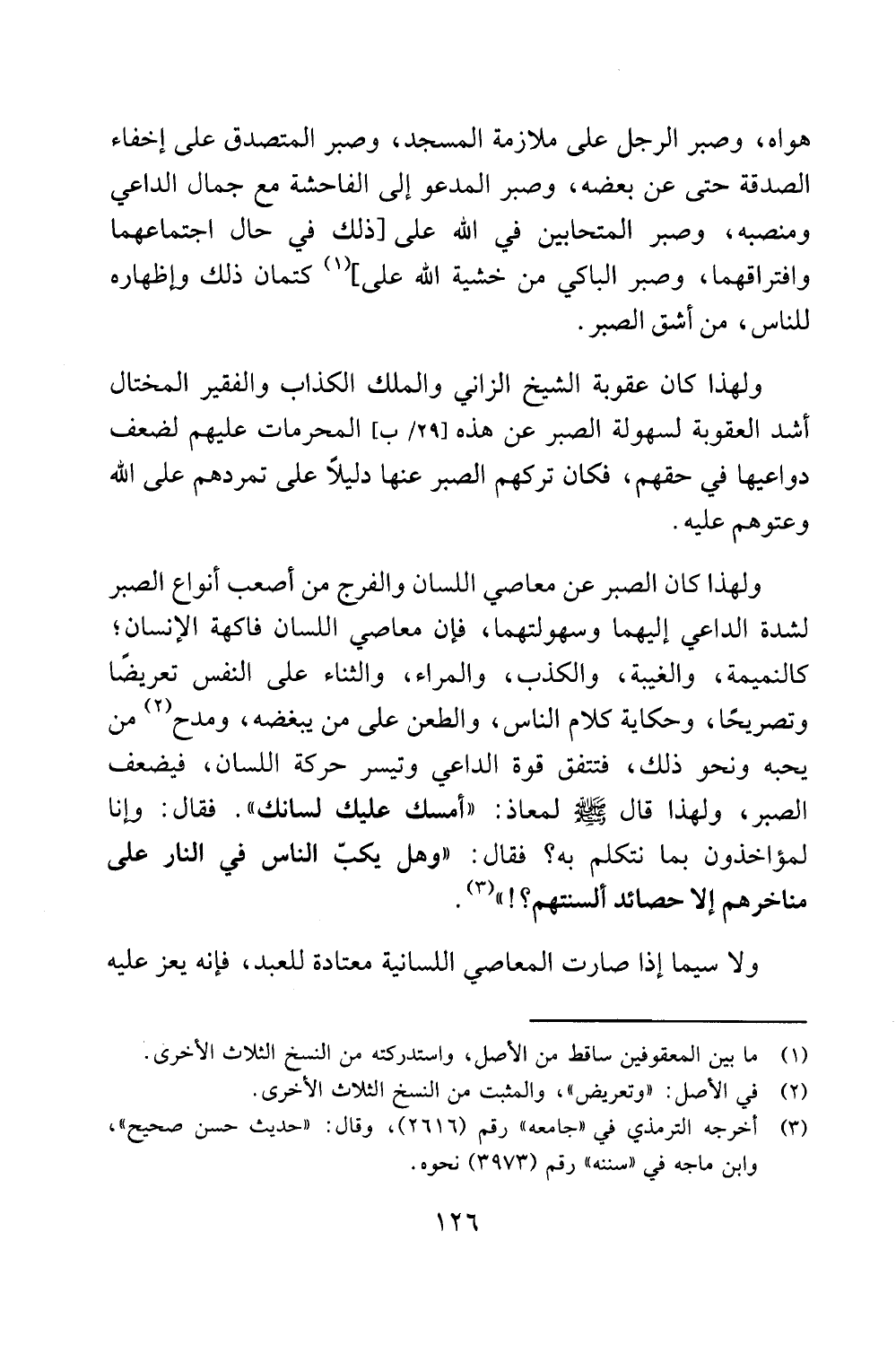 الصبر، ولهذا قال مج! ي! لمعاذ: "أمسك عليك لسانك ". فقال: وإنا