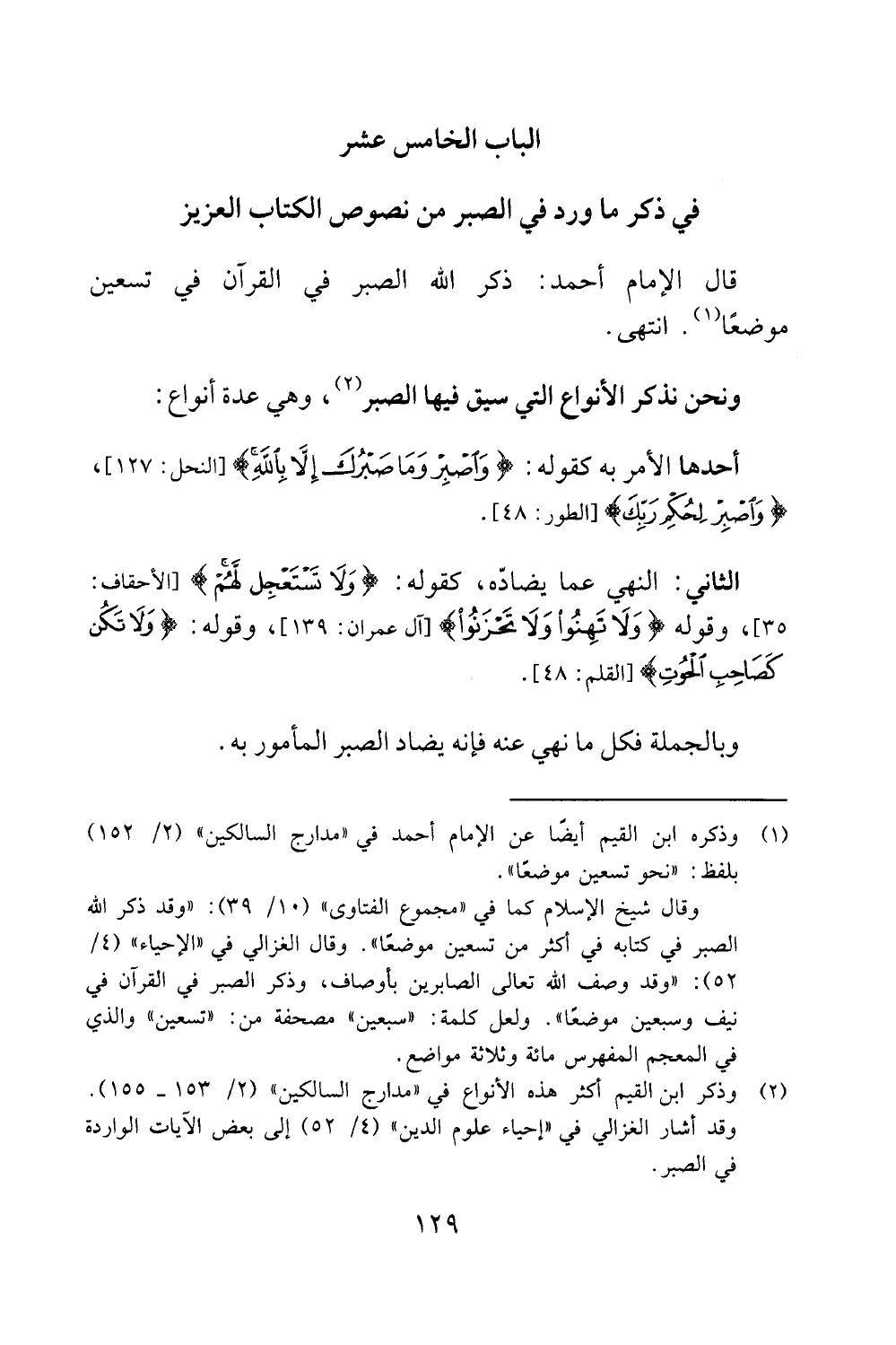 52): "وقد وصف الله تعالى الصابرين باوصاف، وذكر الصبر في القران في