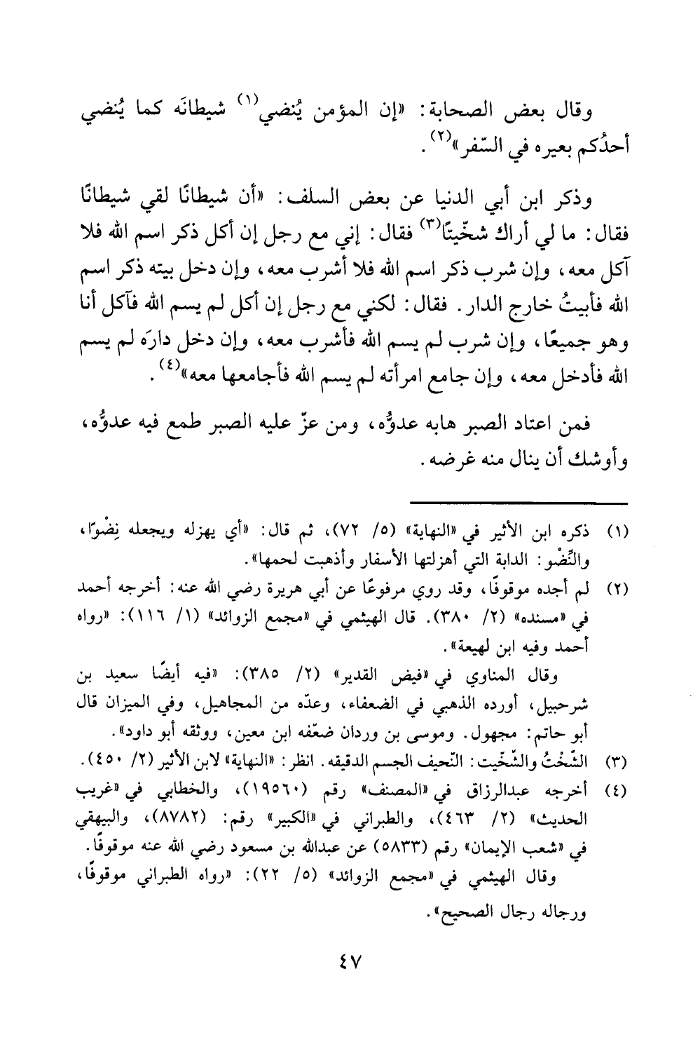 وقال بعض الصحابة: "إن المؤمن ينضي (1) شيطانه كما ينضي