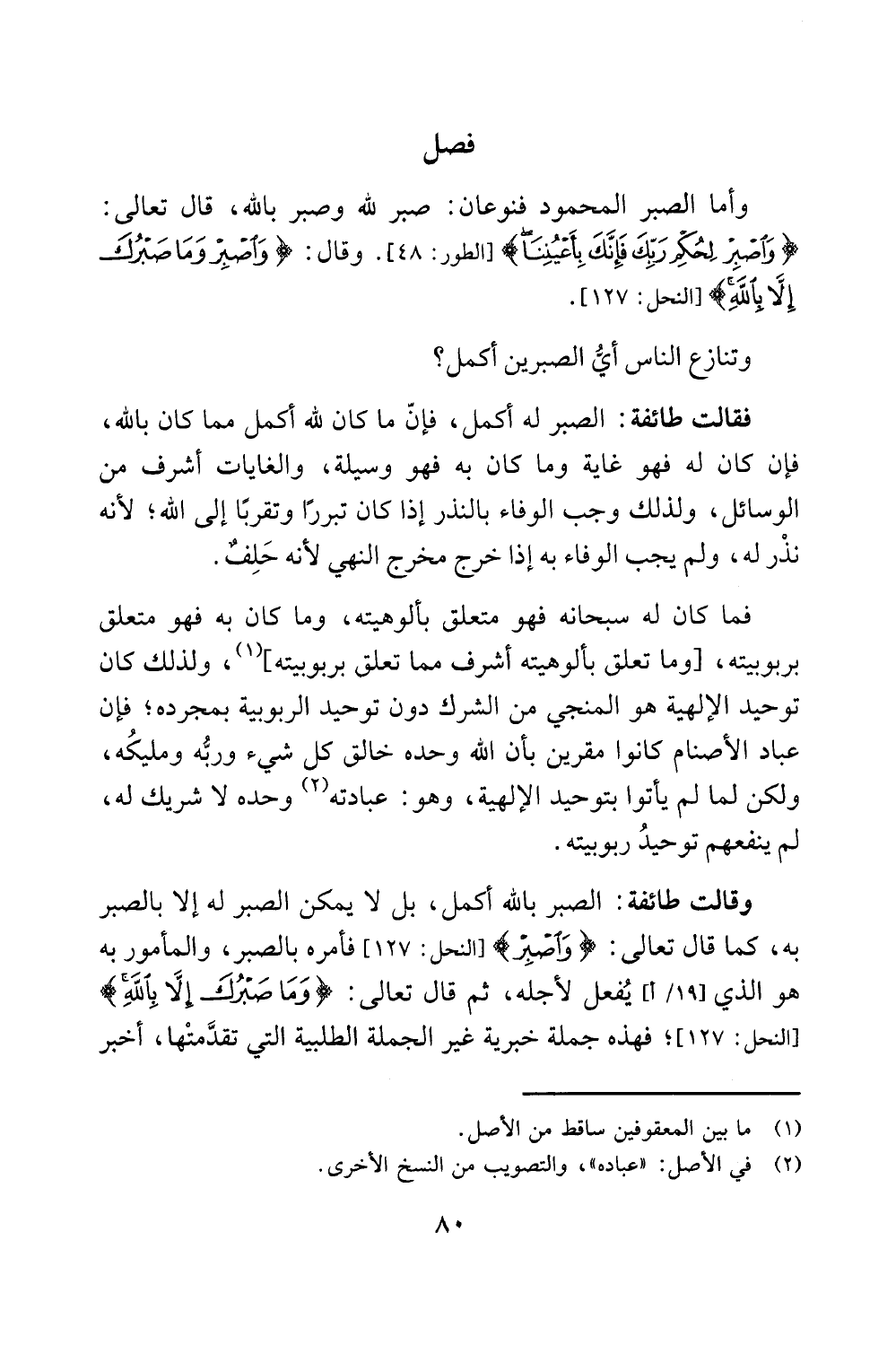 وقالت طائفة: الصبر بالله أكمل، بل لا يمكن الصبر له إلا بالصبر