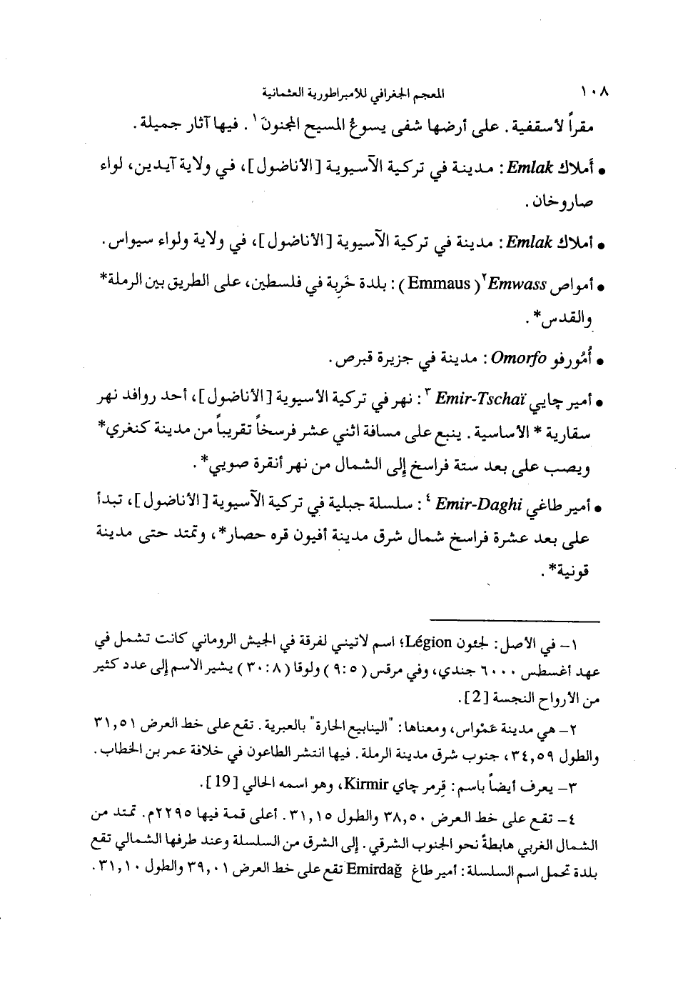 (2) هي مدينة عمواس، ومعناها: = الينابيع الحارة = بالعبرية. تقع على خط العرض 51، 31 والطول 59، 34، جنوب شرق مدينة الرملة. فيها انتشر الطاعون في خلافة عمر بن الخطاب.