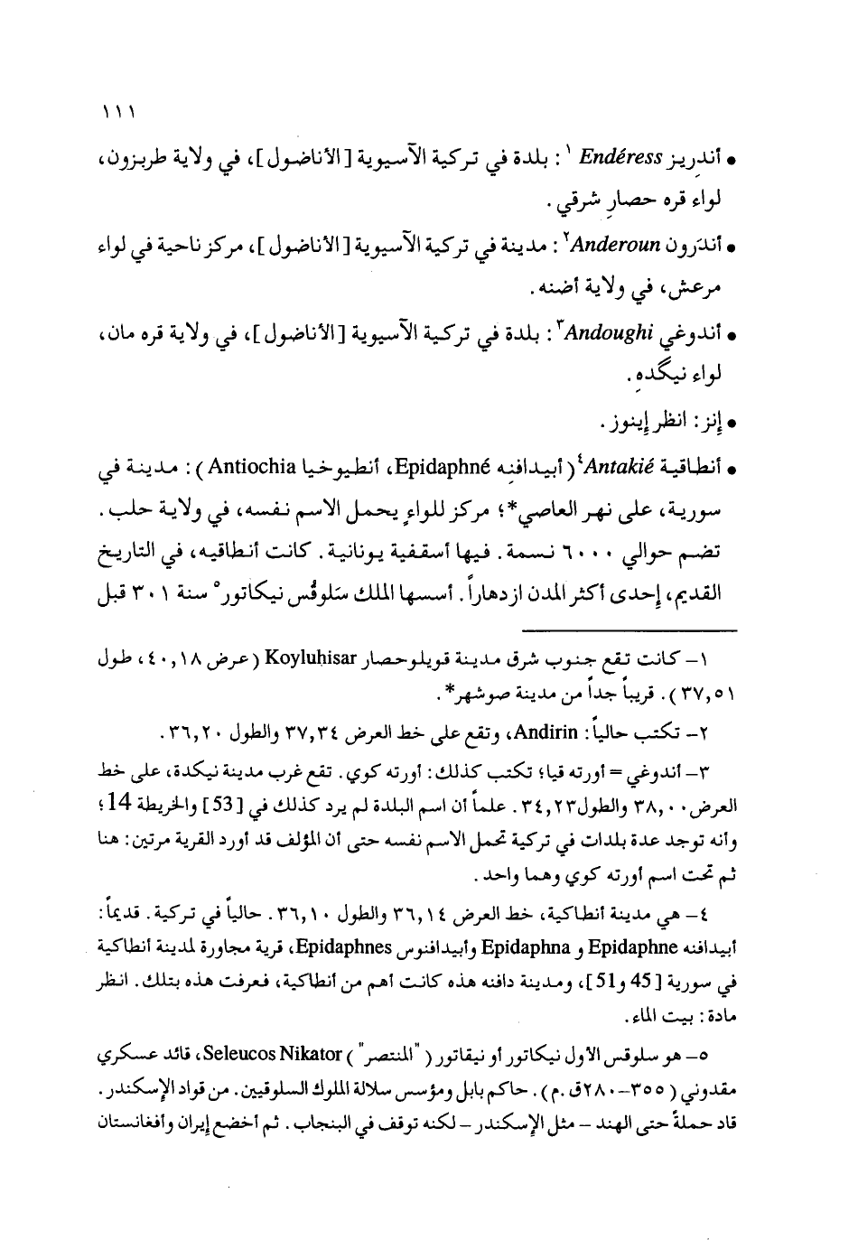 (3) أندوغي أورته قيا تكتب كذلك: أورته كوي. تقع غرب مدينة نيكدة، على خط العرض 00، 38والطول 23، 34. علما أن اسم البلدة لم يرد كذلك في [53] والخريطة 14 وأنه توجد عدة بلدات في تركية تحمل الاسم نفسه حتى أن المؤلف قد أورد القرية مرتين: هنا ثم تحت اسم أورته كوي وهما واحد.